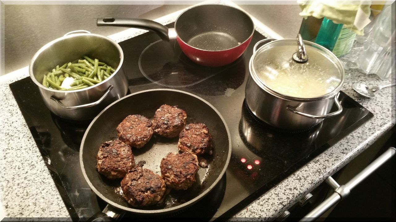 Gutbürgerliche Bouletten mit grünen Bohnen (natürlich aus Ägypten) und Salzkartoffeln: