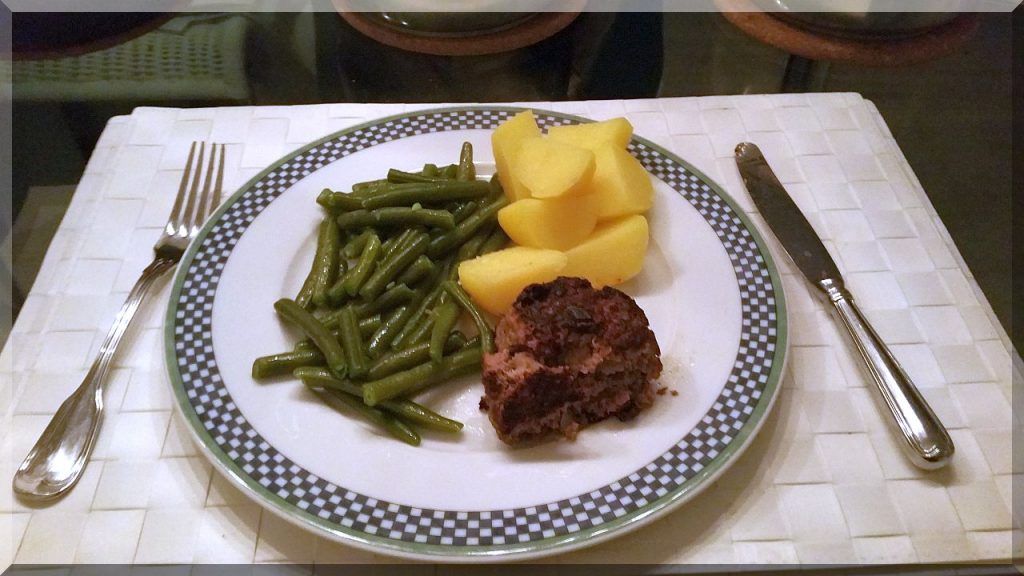 Zutaten: 500 g Rinderhack/Schweinehack oder halb u. halb, grüne Bohnen mit einem EL Butter vor dem Verzehr, Salzkartoffeln, 1 gehackte Zwiebel, 1 aufgeweichtes Brötchen,