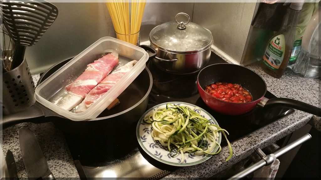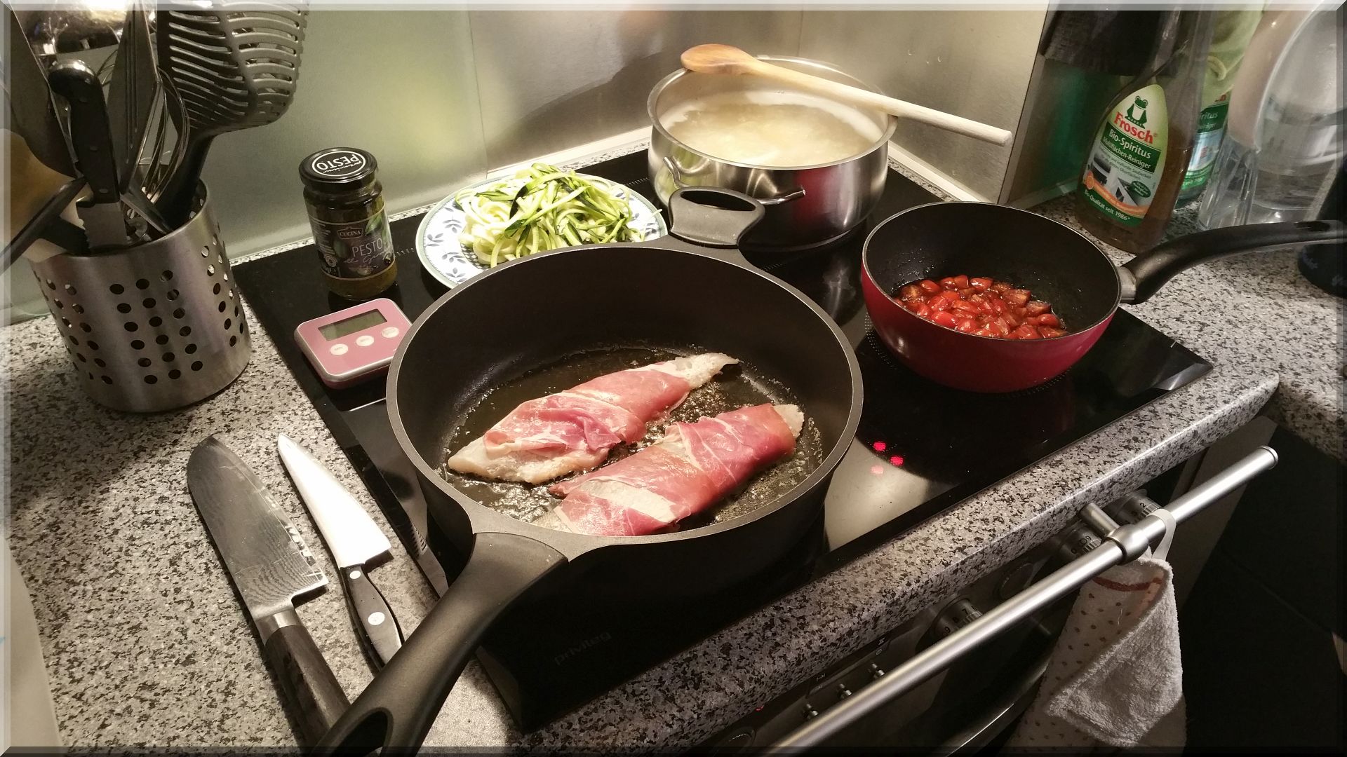 Zanderfilet (aus der Tiefkühltruhe) auftauen u. trocknen, leicht mehlieren, pfeffern (kein Salz) und mit einer Lage Prosciutto Italiano (z.B. Parma) umwickeln und von beiden Seiten ca. 3 Minuten braten bei E-Temperatur 7 v. 9 (zeitgleich fertigstellen mit der Pasta, also 6 Minuten vor dem Ende) / die halbierten Kirschtomaten in 1 TL Butter oder Butterschmalz anbraten und dann mit 3 EL rotem Balsamico einkochen bis dickflüssig ( ca. 15 Minuten – dann nur noch warm halten) / Linguine parallel zubereiten, Zucchini ( mit Julienneschneider in Spiralen gedreht – in den letzten 3 Minuten zu den Linguine hinzufügen) nach dem Abgießen mit 150 ml = 3/4 Glas Pesto Genovese von Barilla (!) durchmengen: