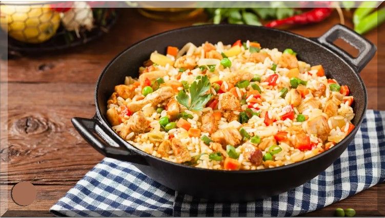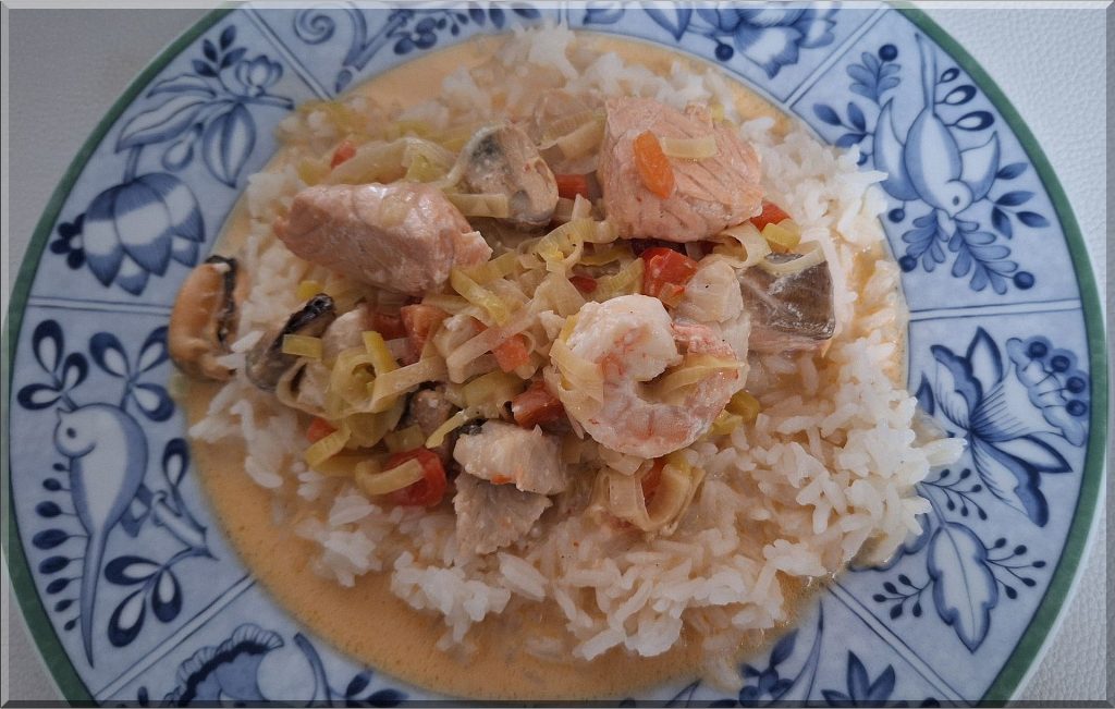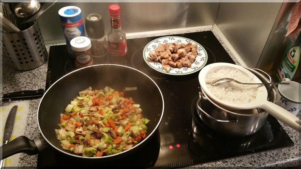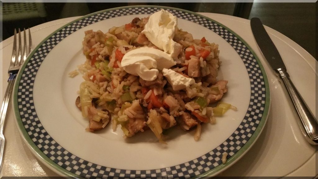 Für 2 Personen: Gemüsereste (2 Karotten, Champignons, 1 Lauchstange, 1 gepreßte Knoblauchzehe) scharf anbraten und dann auf halber Hitze weiter garen / Pollo fino gewürfelt (ausgebeinte Hühner-Oberschenkel ohne Haut) scharf anbraten und dann zur Seite tun / 1 knappe Tasse Jasminreis zubereiten und abschrecken / zum Schluß alle Teile zusammenfügen und gut durchmengen, erneut gut erhitzen und mit einer Haube Crème Fraîche servieren: