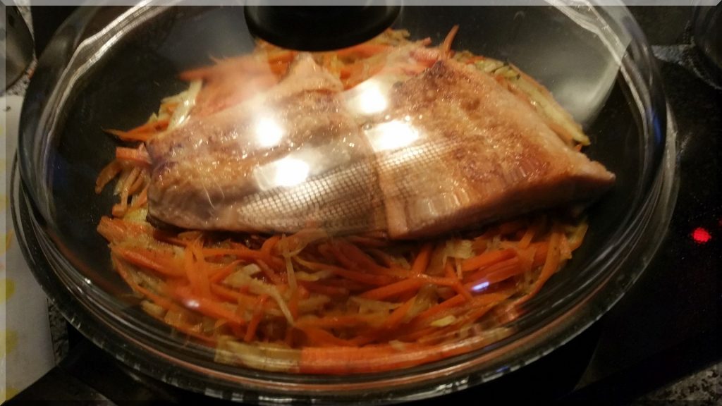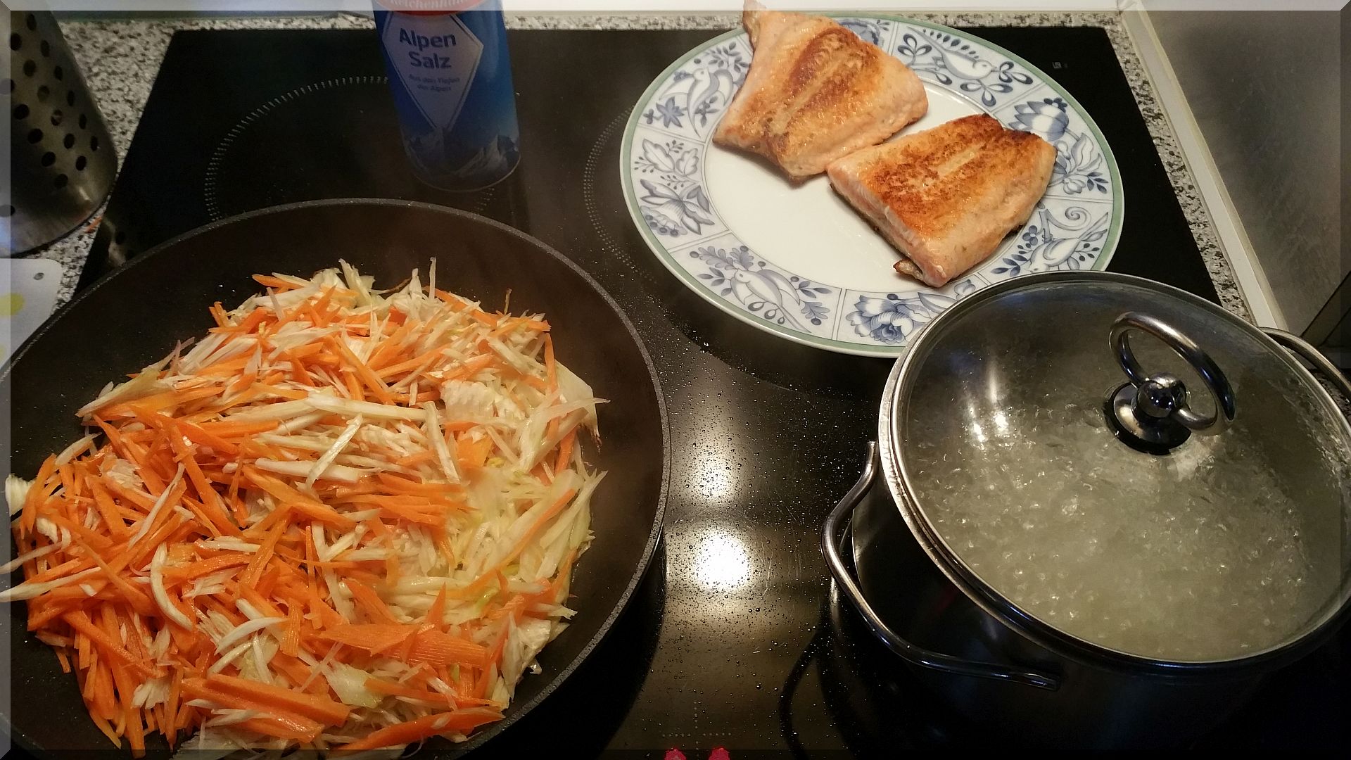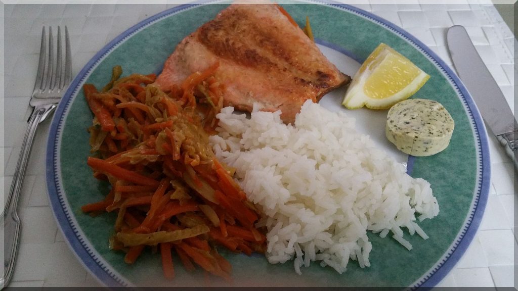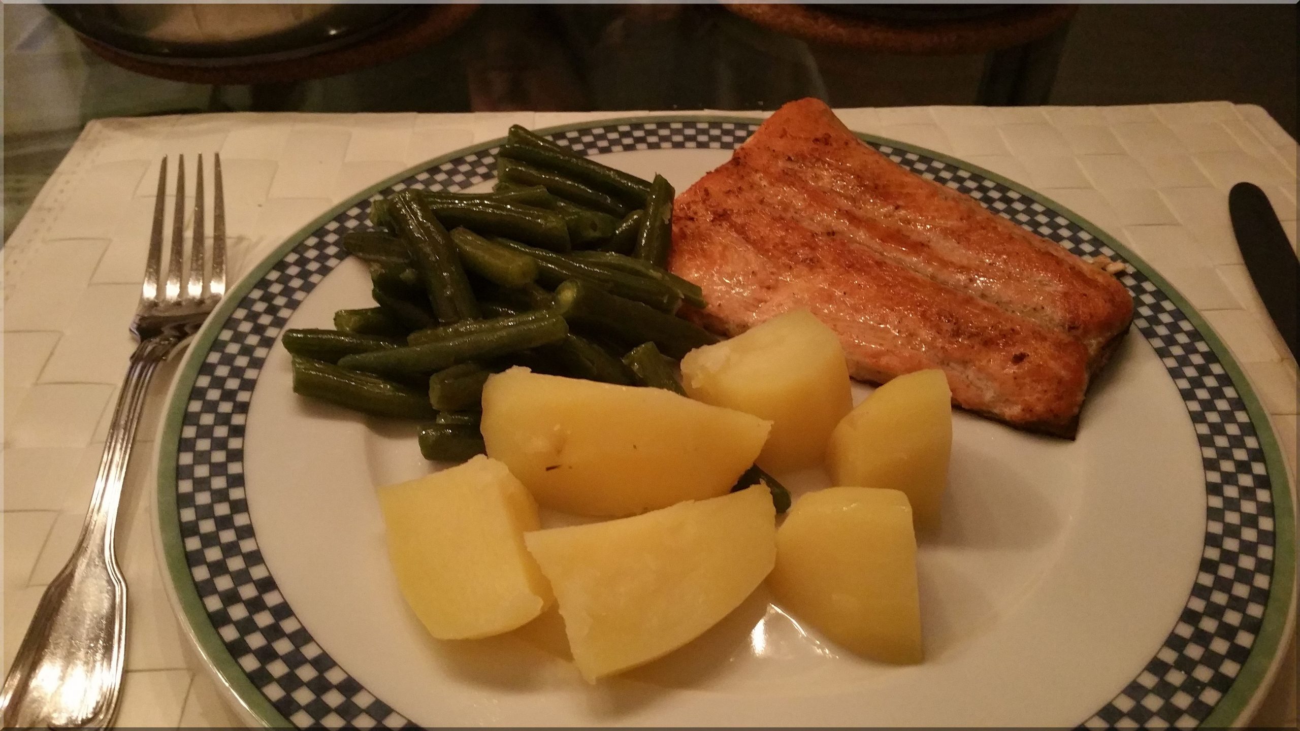Eines unserer Lieblingsessen: Lachsforellenfilet mit knackigen, gebutterten grünen Bohnen aus Ägypten (!) und Salzkartoffeln. Zuerst bei großer Hitze den Fisch auf der Hautseite 4-5 Minuten scharf anbraten, dann wenden und bei mittlerer Hitze 3-4 Minuten fertig braten.