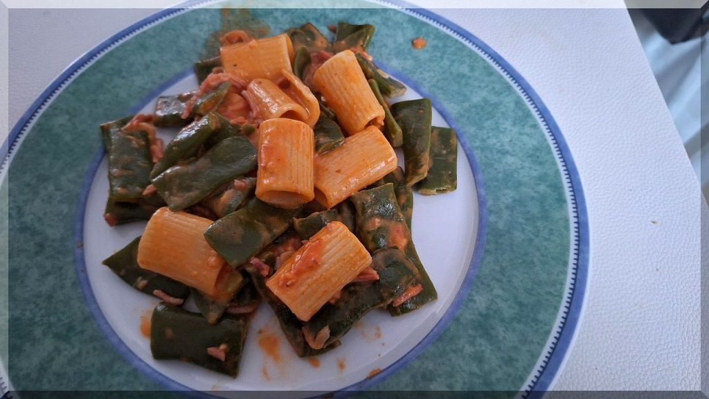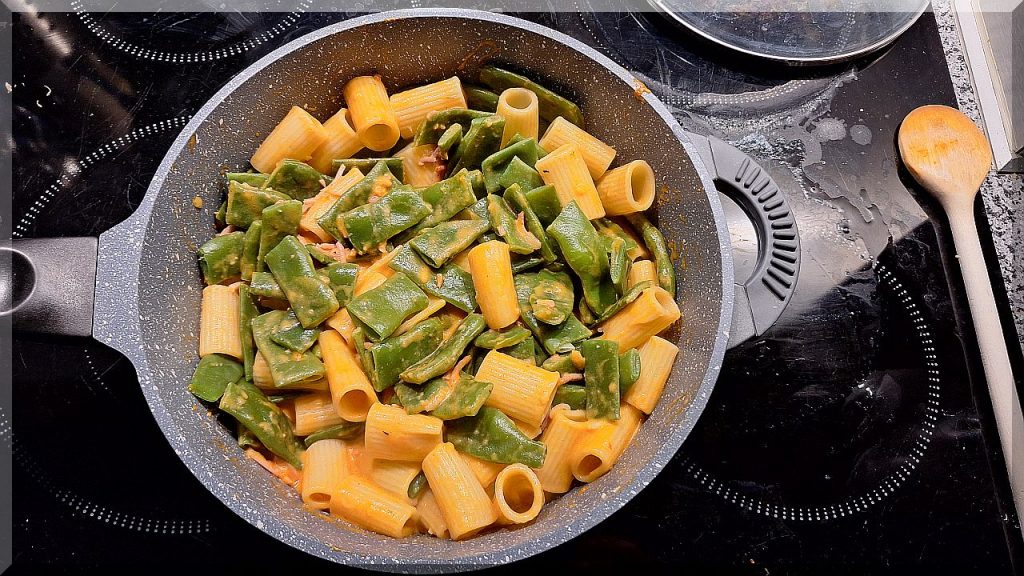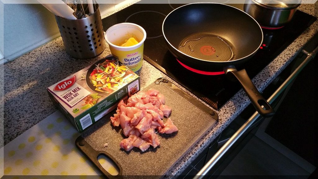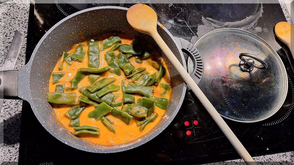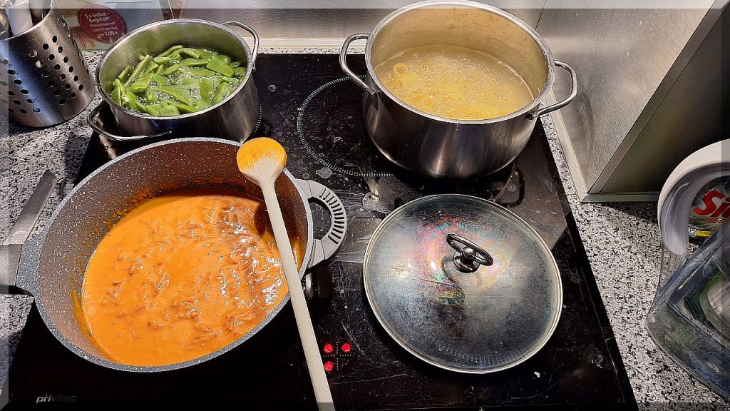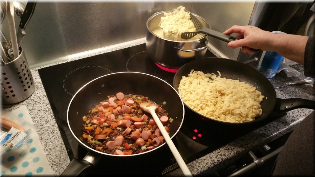 17 Uhr – Ich bin in der Küche. Marianne bereitet den Spätzle Teig zu und ich schnippele geschälte Paprika und Frühlinszwiebeln in Würfel und das wird in der Wokpfanne mit etwas Butterschmalz angedünstet. Nach 10 Minuten kommen die Linsen ( Fa. HAK) dazu und Salz, Pfeffer, 1 Prise Chilipulver, 2 EL Condimento Bianco und 50 bis 100 ml Sahne oder Crème Fraîche dazu. Nach weiteren 5 Minuten werden 3 zarte, geschnittene Wiener Würstchen unter die Linsen gemengt und nach 10 Minuten serviert.