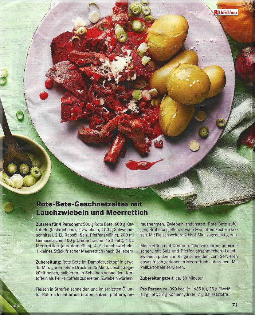 Geschnetzeltes Schweinefilet mit vorgekochten Roten-Beeten (in Folie in der Gemüseabteilung) in einer Zwiebel-Sahnesoße und Pellkartoffeln. Zwiebelwürfel glasig gedünstet, dann das geschnetzelte Fleisch hinzugegeben bis es soft gebraten war. Dann Brühe dazugegeben und die halben Scheiben der zerkleinerten Knollen der Roten-Beete dazugegeben, 2 EL gehäufte Crème Fraîche und 4 gehäufte TL Sahnemeerrettich untergehoben. Mit Salz, Pfeffer, 1 Prise Chilipulver gewürzt.