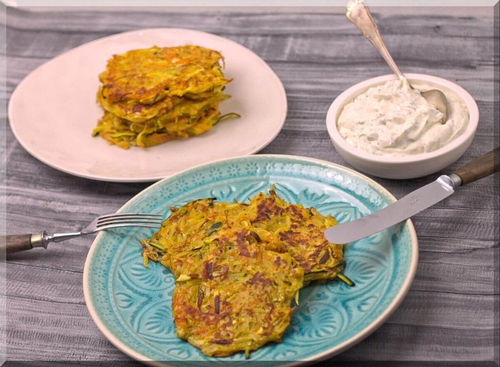 Zutaten für 2 Personen: 6 Kartoffeln (festkochend), 1 Zucchini, 1 Möhre, 1 Zwiebel – alles durch die Zyliss Alu Trommelreibe drehen und mit einem Tuch trocken ausdrücken. Anschließend die Masse + 2 EL Mehl (Type 405 oder Mondamin), 1 Ei, Salz, Pfeffer, Rosenpaprika, Muskat und als i-Tüpfelchen 2 EL Crème Fraîche dazu geben, alles mit dem Handmixer 5 Minuten durchrühren.