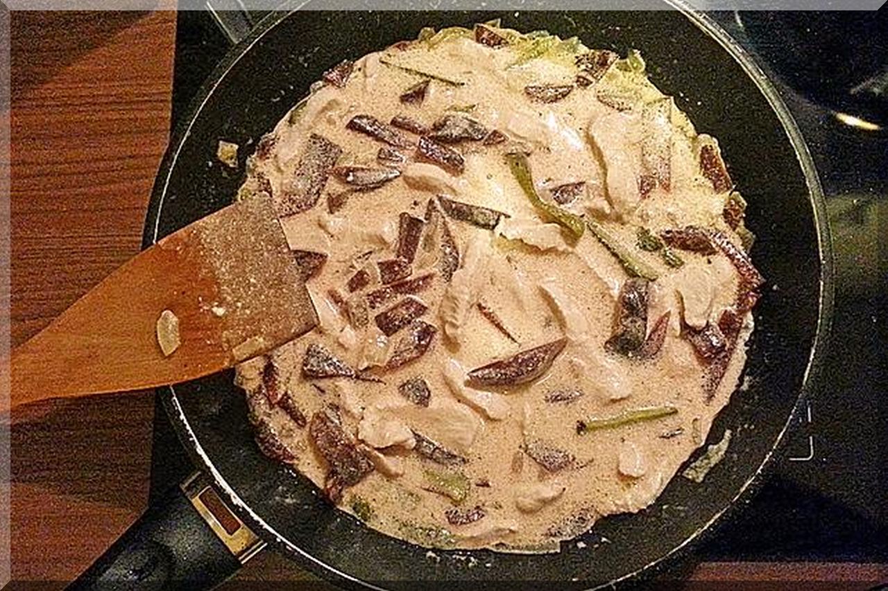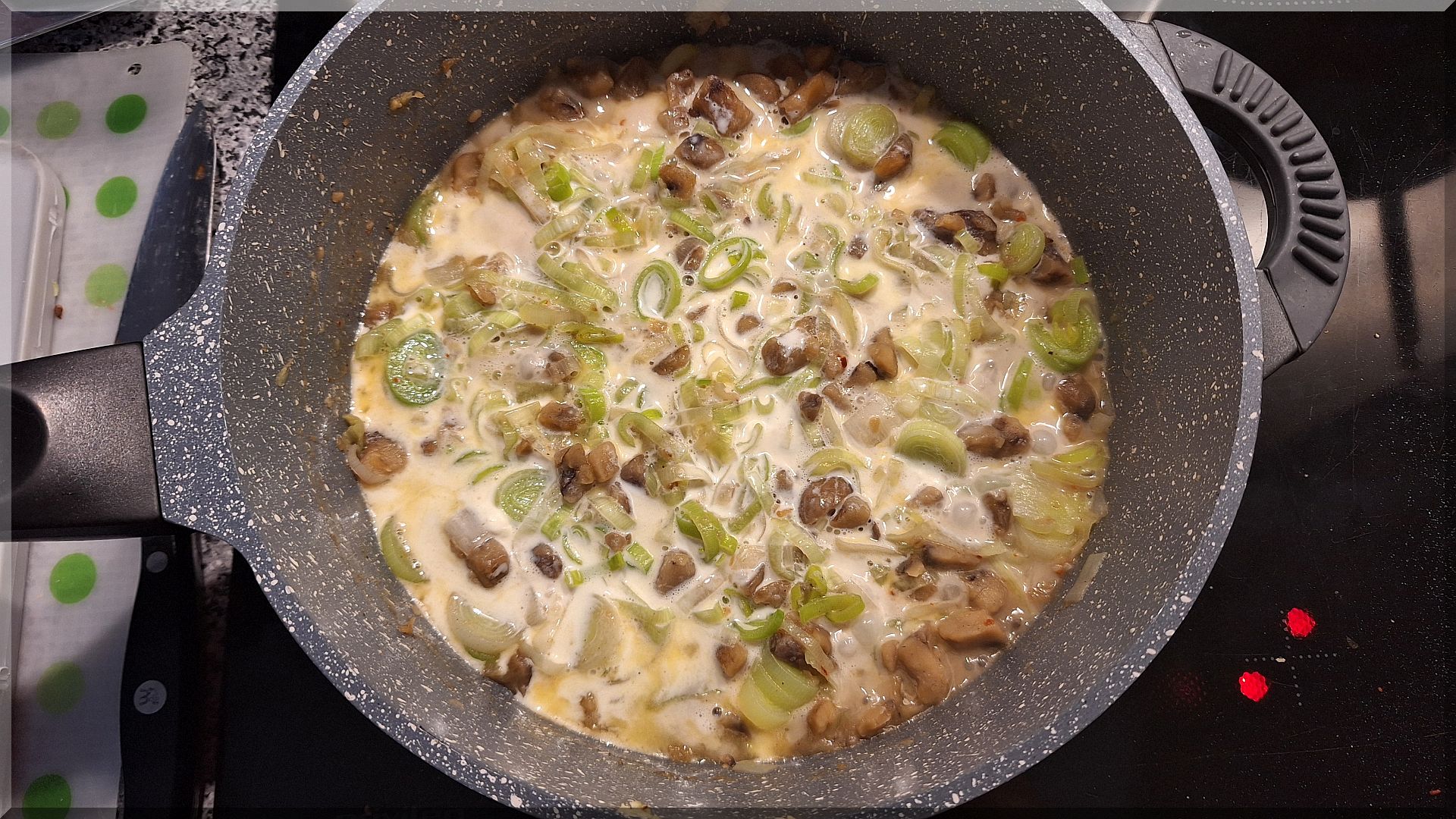 - Gieße mit etwas Wasser und 100 ml Sahne auf und lass alles mit geschlossenem Deckel 15 Minuten köcheln.