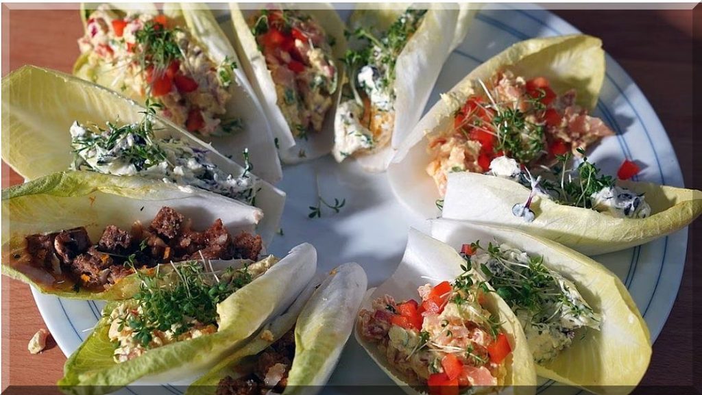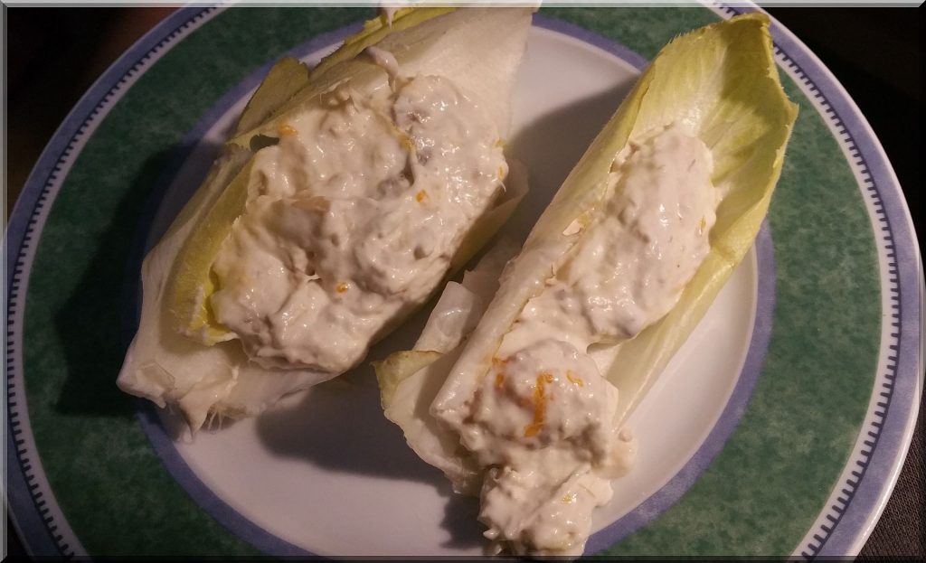 Für den kleinen Hunger zwischendurch: Geflügelsalat auf Chicorée-Blättern: