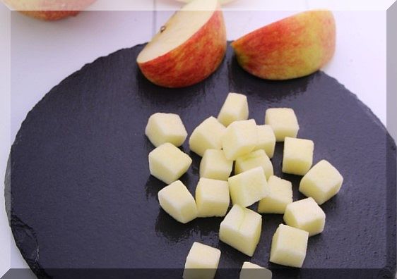 - Schneide ihn dann samt Schale in Würfel. (wir schälen den Kürbis immer)