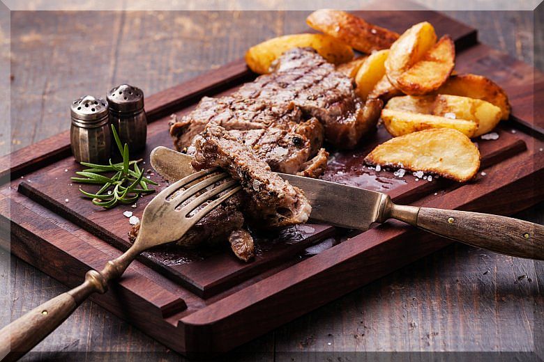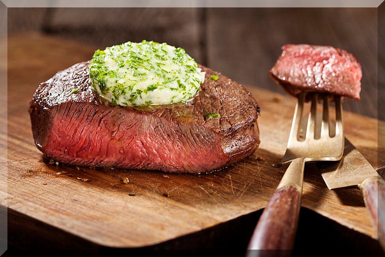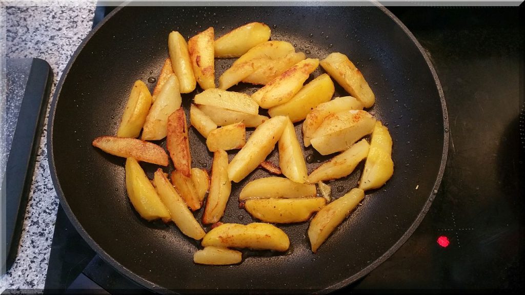 In einer stark erhitzten Pfanne bei starker Hitze (E-Herd Stufe 9) beidseitig anbraten, je 3 Minuten, dann auf halber Hitze (E-Temperatur 6 v. 9) weiterbraten und weiterhin alle 3 Minuten wenden, insgesamt 21 Minuten.