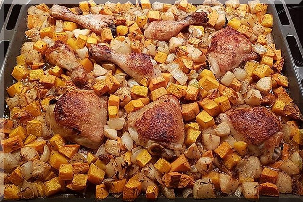 Zubereitung: Geschnippeltes und mit Salz, Pfeffer, Paprika u. 2 Prisen Chili gewürztes Backofengemüse bei 200°C im Backofen für 20 Minuten vorgaren, dann die Pollo-Teile (zuvor mit ÖL, Salz, Pfeffer u. Paprikapulver eingerieben) zugeben und alles zusammen erneut 20 Minuten garen, also insgesamt 40 Minuten.