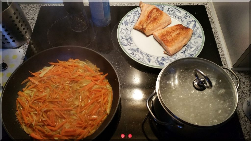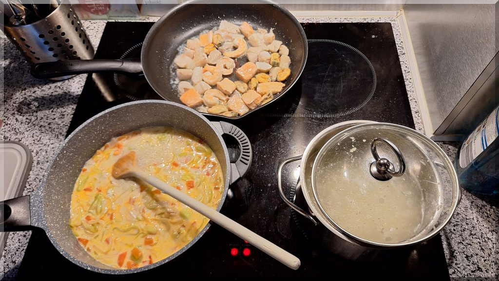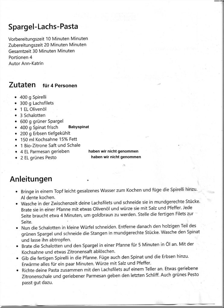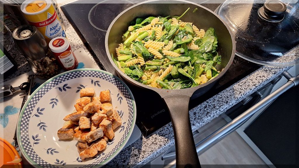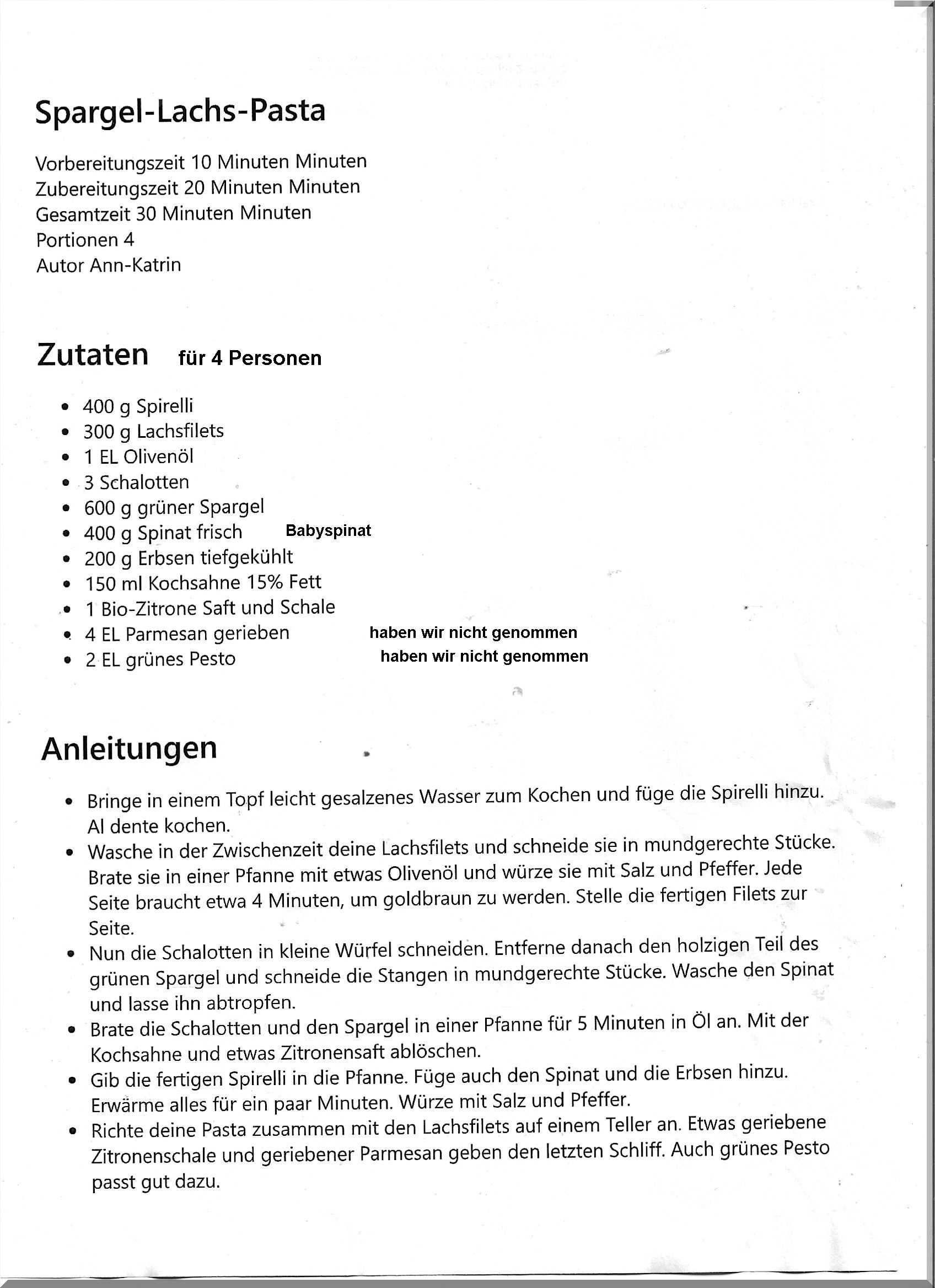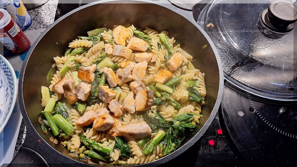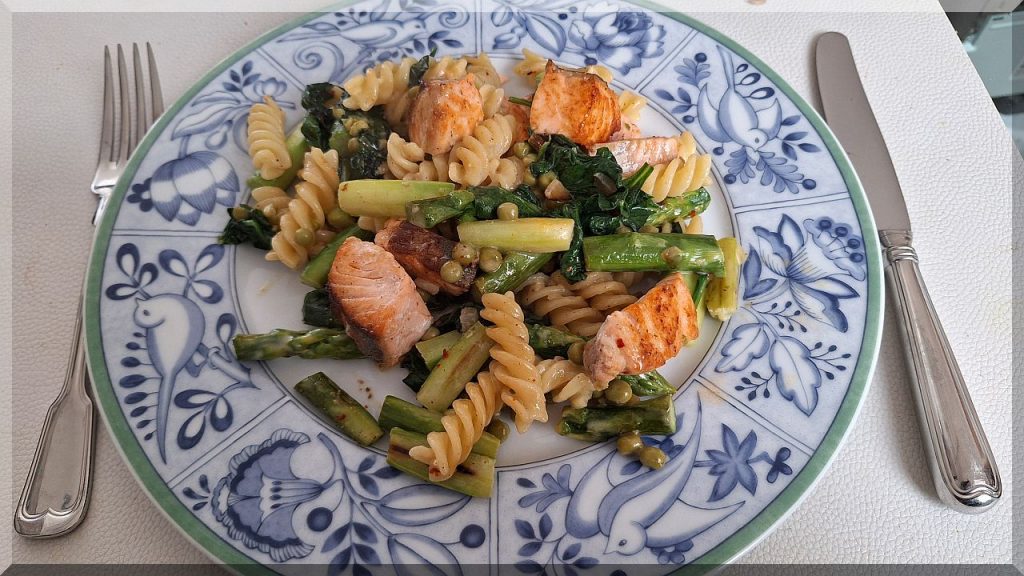 (Wir haben für uns 2 etwas weniger Spirelli genommen, dafür einen ganzen Bund grüner Spargel und mehr Lachsfilet 300 g, 125 g Babyspinat, eine kleine Dose Erbsen und 100 ml Sahne, Knoblauch, Salz, Pfeffer, Chiliflocken)