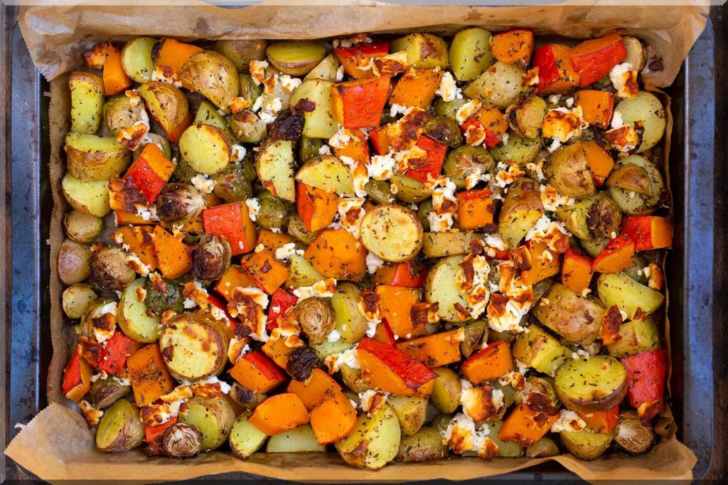 Die Kürbisspalten und den Rosenkohl einölen und in den Backofen schieben, bei vorgeheizten 200 °C für 15 Minuten garen. Nach und nach kommen dann die Champignons, die Roten-Beete und die Gnocci dazu und alles wird weitere 10 Minuten garen. Gemüsebrühe und Sahne dazugeben und weitere 10 Minuten garen. Ich würde ja noch einen Apfel würfeln und beimengen (Veto von Marianne). Dann noch den geriebenen Käse drüberstreuen und auf der Grillstufe weitere 10 Minuten überbacken.