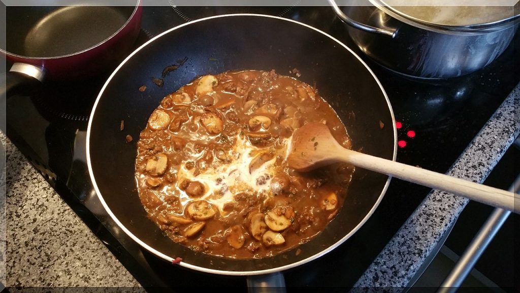 Die Soße kosten, eventuell nochmals nachwürzen und zuletzt mit der Schlagsahne verfeinern.