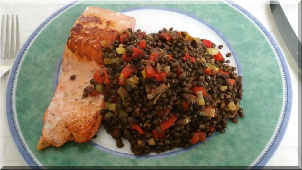 Ich habe früher, an Bord, in meine Linsengerichte auch immer eine kleine Dose Ananas-Stückchen untergemengt, das ergab immer eine ganz pikante Note. Würde ich auch heute noch tun, doch Marianne kann sich für Früchte im Essen nicht erwärmen. Dafür füge ich heute Condimento Bianca bei, was auch eine liebliche, säuerliche Note ergibt. Demnächst werde ich zu Linsen trotzdem Ananasstückchen als Beilage reichen, dann kann ich mir die Ananas separat untermengen, sozusagen Linsen Hawaii.