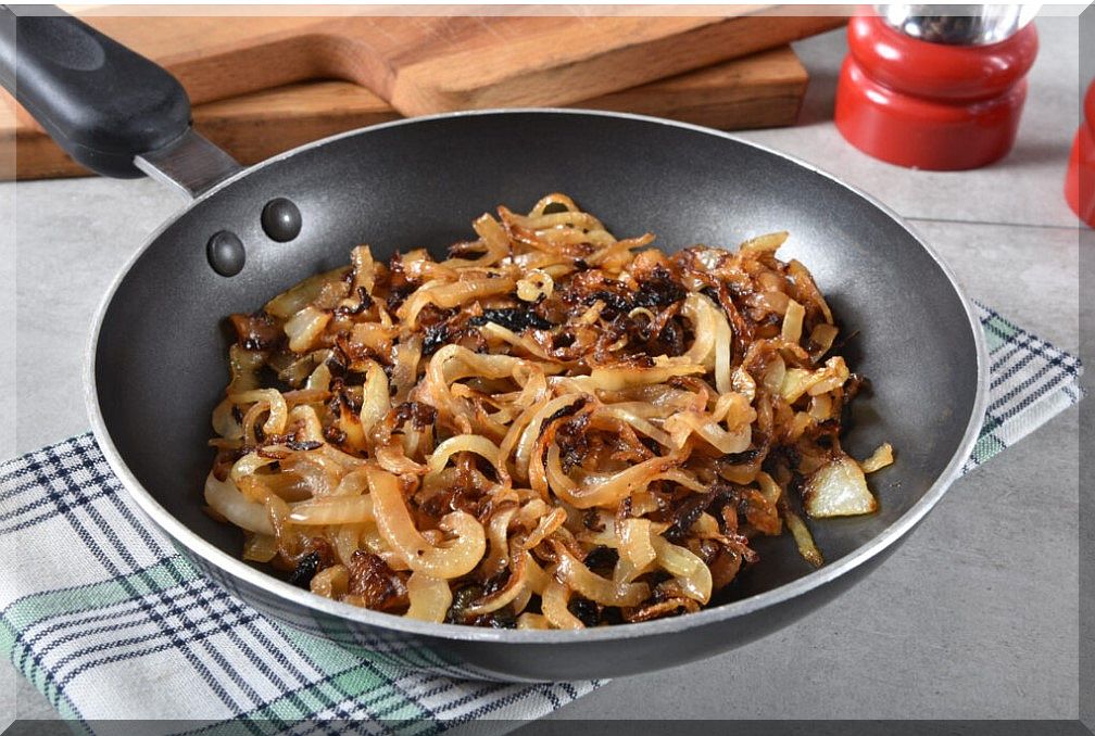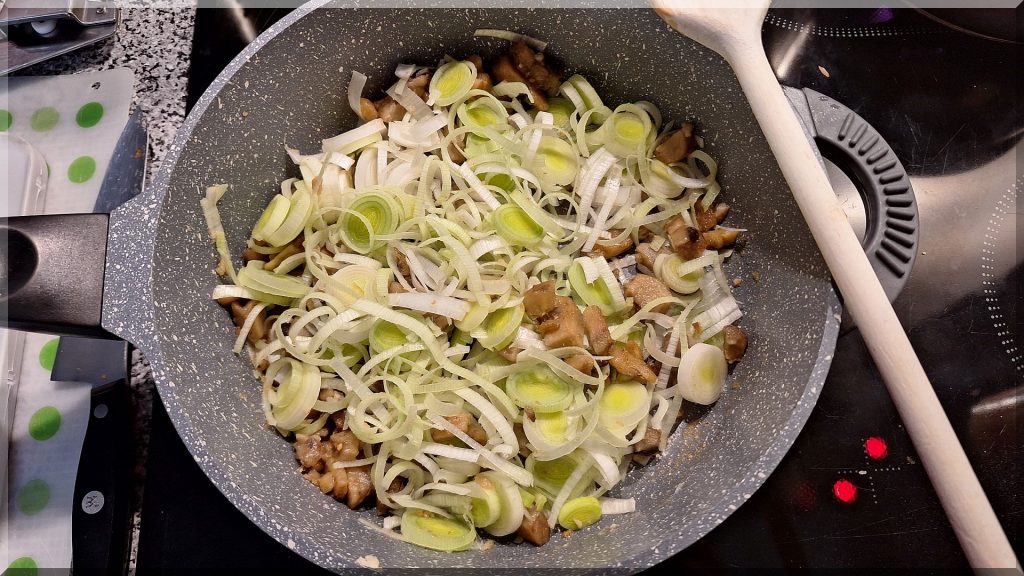 Rahmchampignons u. Zwiebeln stark anbraten + Salz u. Pfeffer