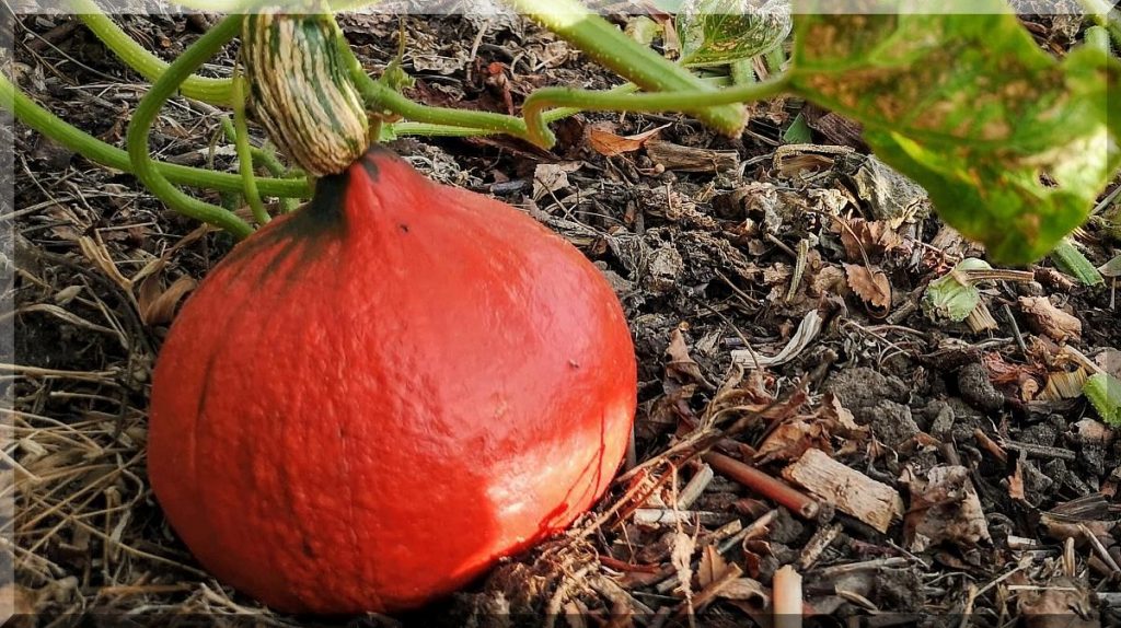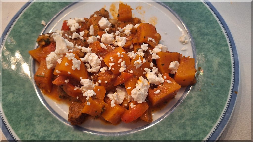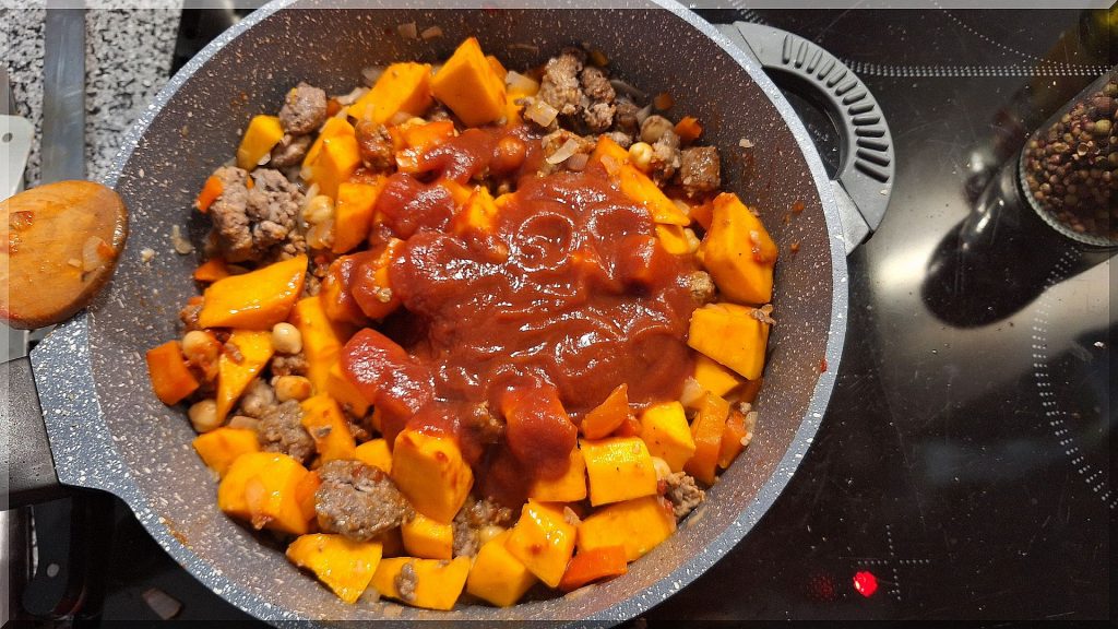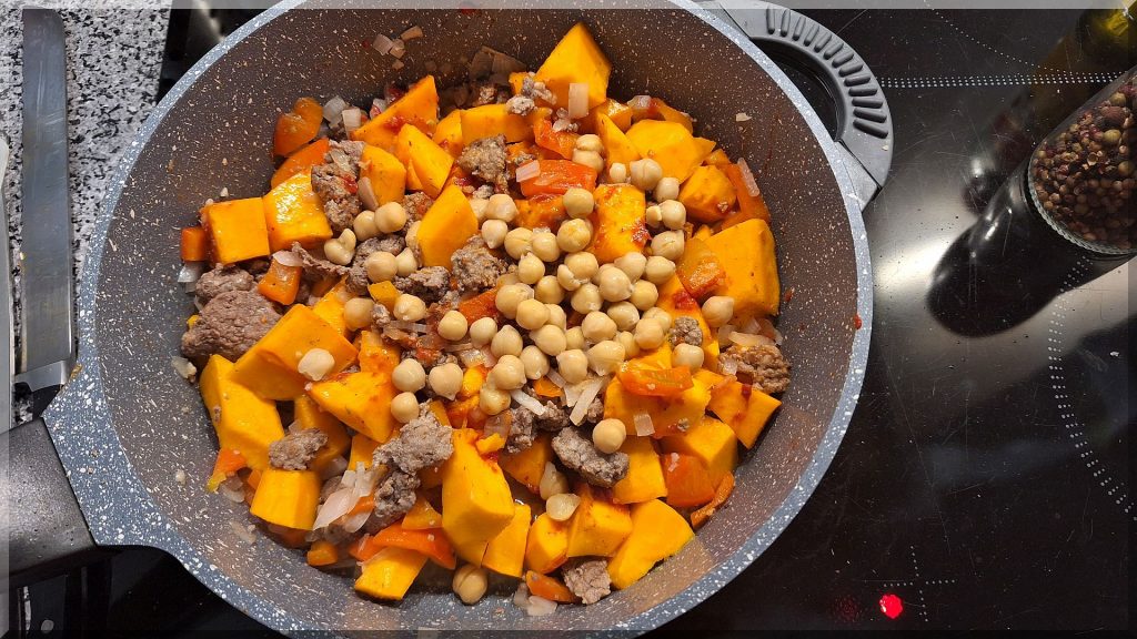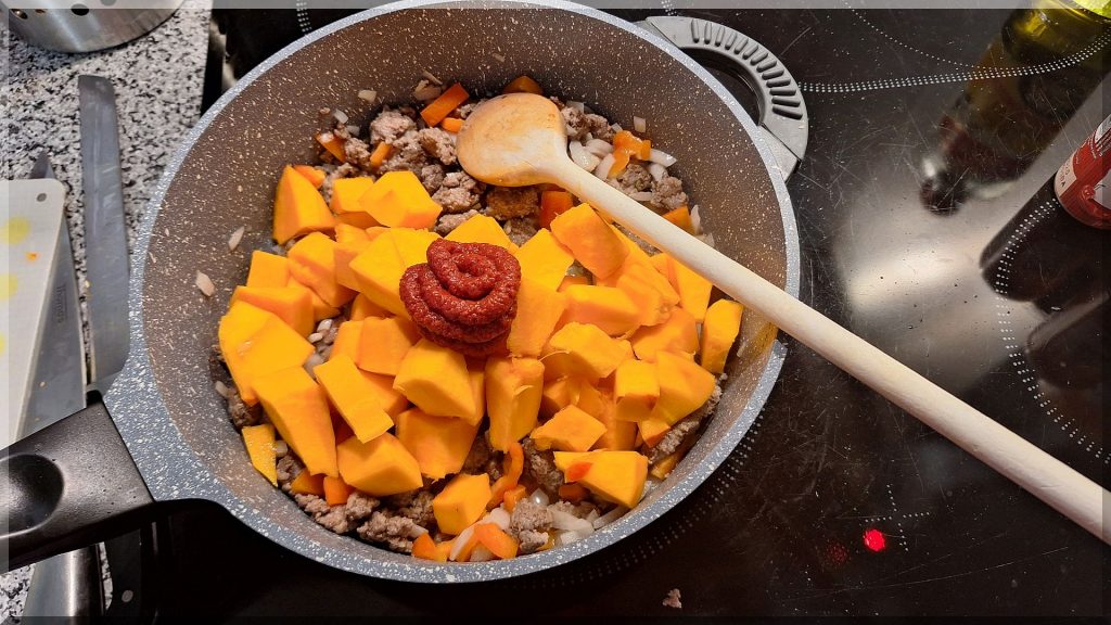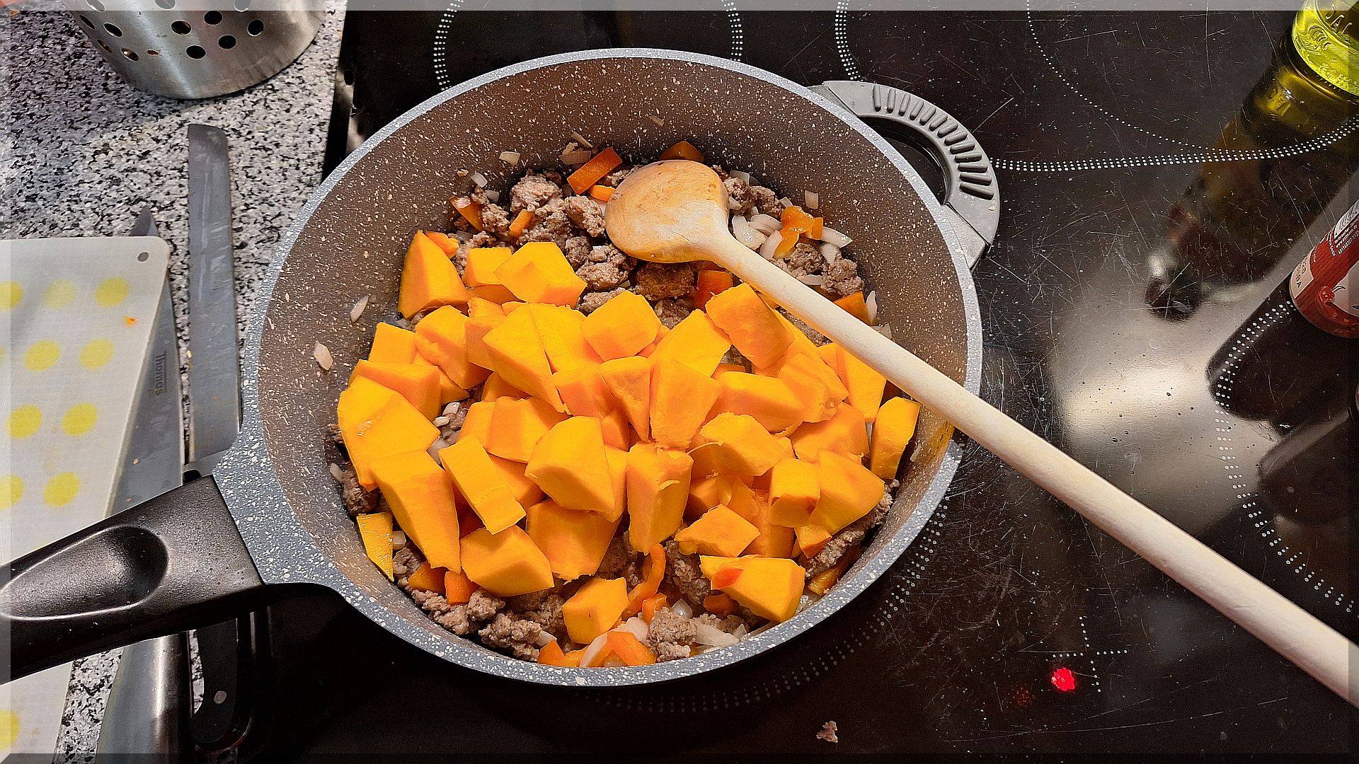 - Dann kommen auch die Kürbiswürfel, sowie Zwiebel und Knoblauch hinzu.