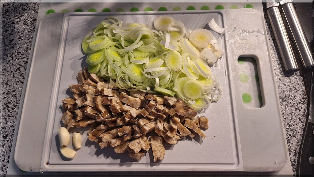 - Schäle Zwiebel und Knoblauch und hacke beides klein. (Knoblauch durchgedrückt)