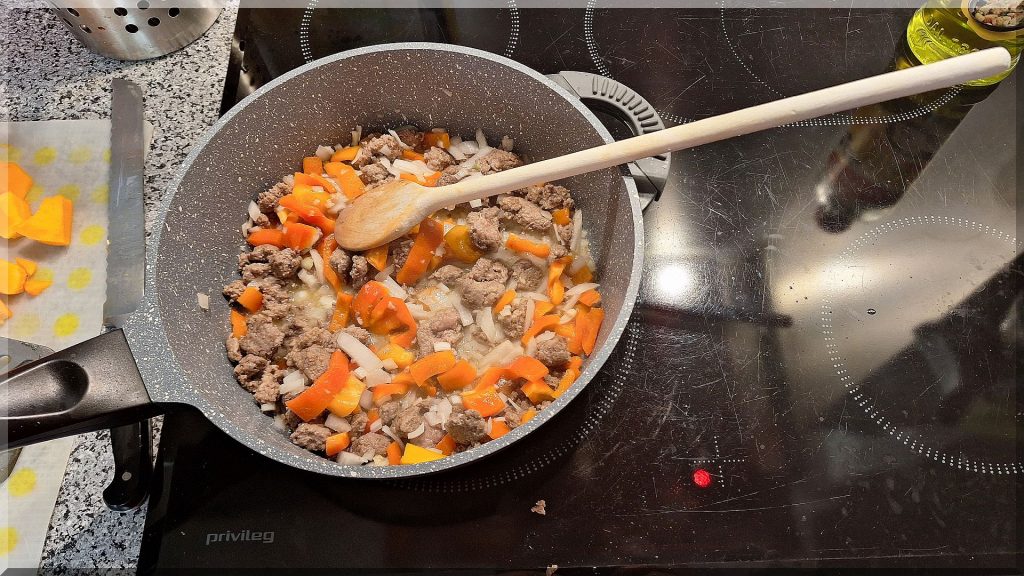 - Schneide die Paprika in Würfel und gib sie zu dem Fleisch.