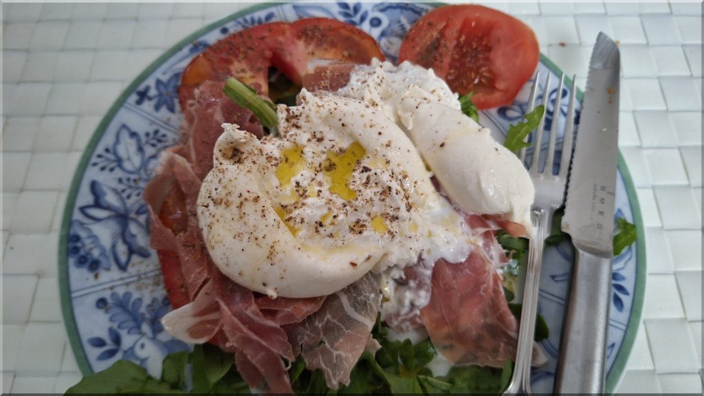 Wir haben Pfirsich, Honig und Basilikum nicht genommen, dafür Rucula. Als Schinken haben wir Parma genommen. Vom Büffel-Burrata waren wir begeistert, hatten wir noch nie.