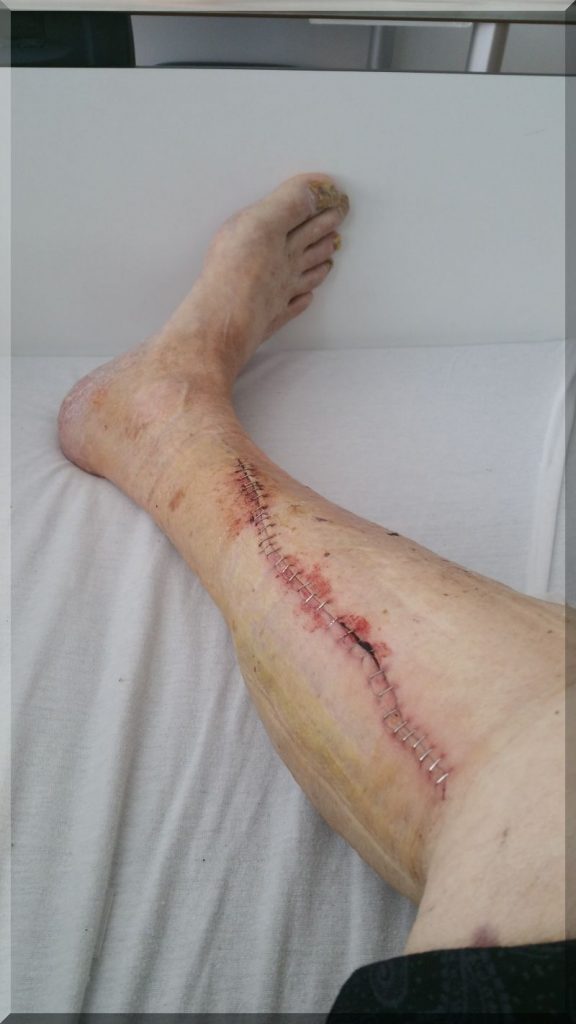 Nach 1 Woche sollte ich schon wieder entlassen werden, doch wurde das durch die nässende Wunde am Unterschenkel verhindert.
