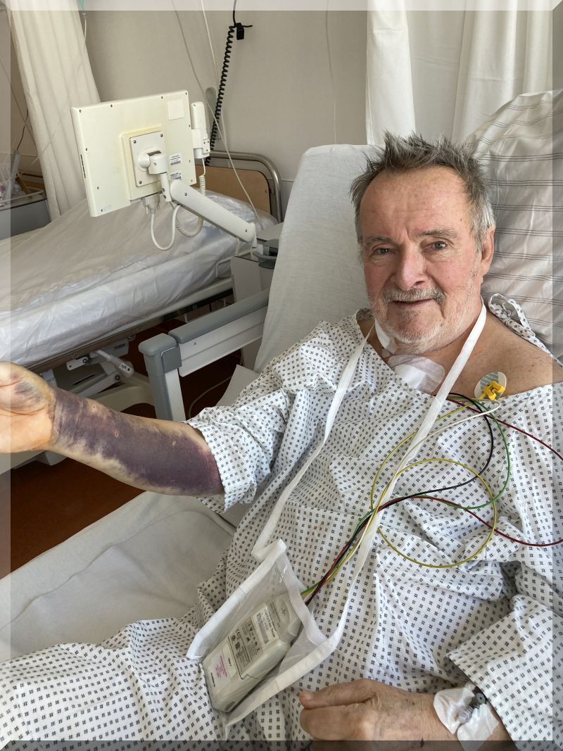 Der Notarzt nahm mir, zeitlich unterschiedlich, 2 x Blut ab, um die Biomarker für einen Herzinfarkt abzuklären. Wir warteten angespannt auf das Ergebnis. Das Resultat deutete auf einen akuten Herzinfarkt hin. Wenige Minuten später lag ich auf einer OP-Liege. Es folgte eine Herzkathederuntersuchung, die eine weitere Behandlung in Sindelfingen ausschloss – totale Verengung aller Herzkranzgefäße.