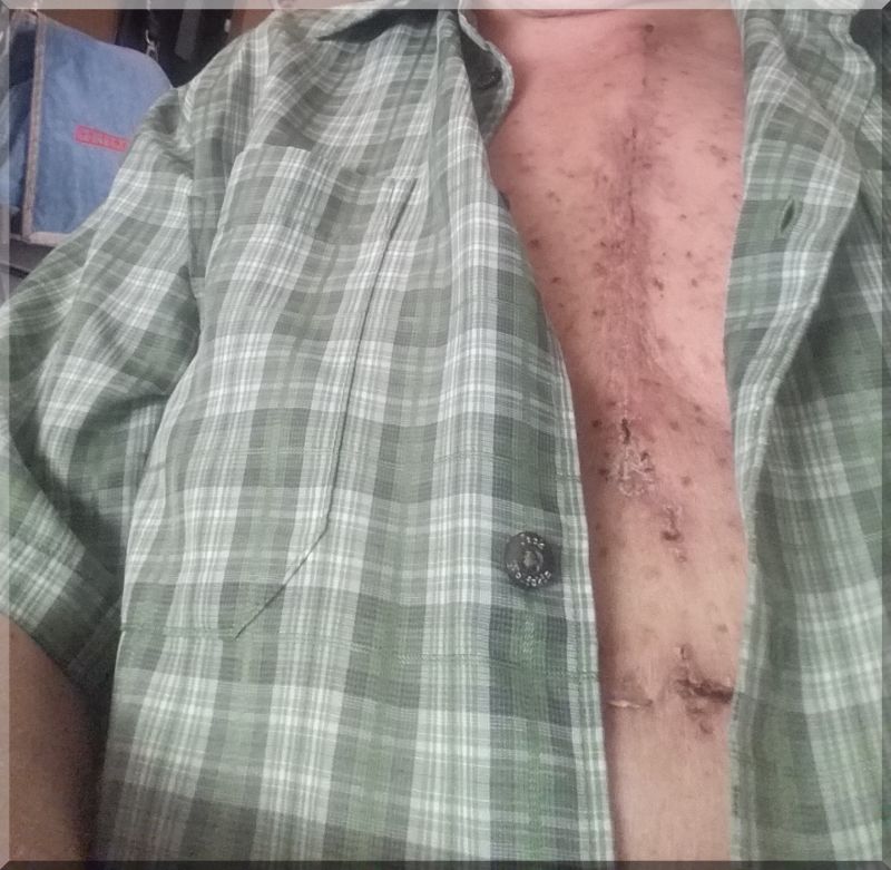 Die korrespondierende lange Narbe auf dem Brustkorb ist dagegen sehr gut und absolut trocken verheilt.