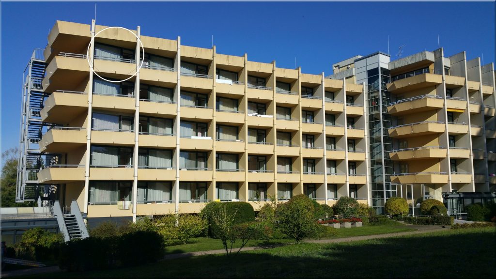 10:15 Uhr – Ich war auf einem ersten Spaziergang im Klinikgelände. Es war herrlich. Überall roch es nach frisch geschnittenem Gras. Ich habe das Gebäude im UG verlassen und musste mich zum Wiedereintritt zum Rezeptionseingang durchfinden. Dabei entdeckte ich auch eine Menschenmenge an einem kleinen Pavillon für Raucher. Ich nahm einen Moment Platz und genoss den Tabakduft an der frischen Luft, obwohl ich seit 30 Jahren nicht mehr rauche und auch nicht mehr möchte.