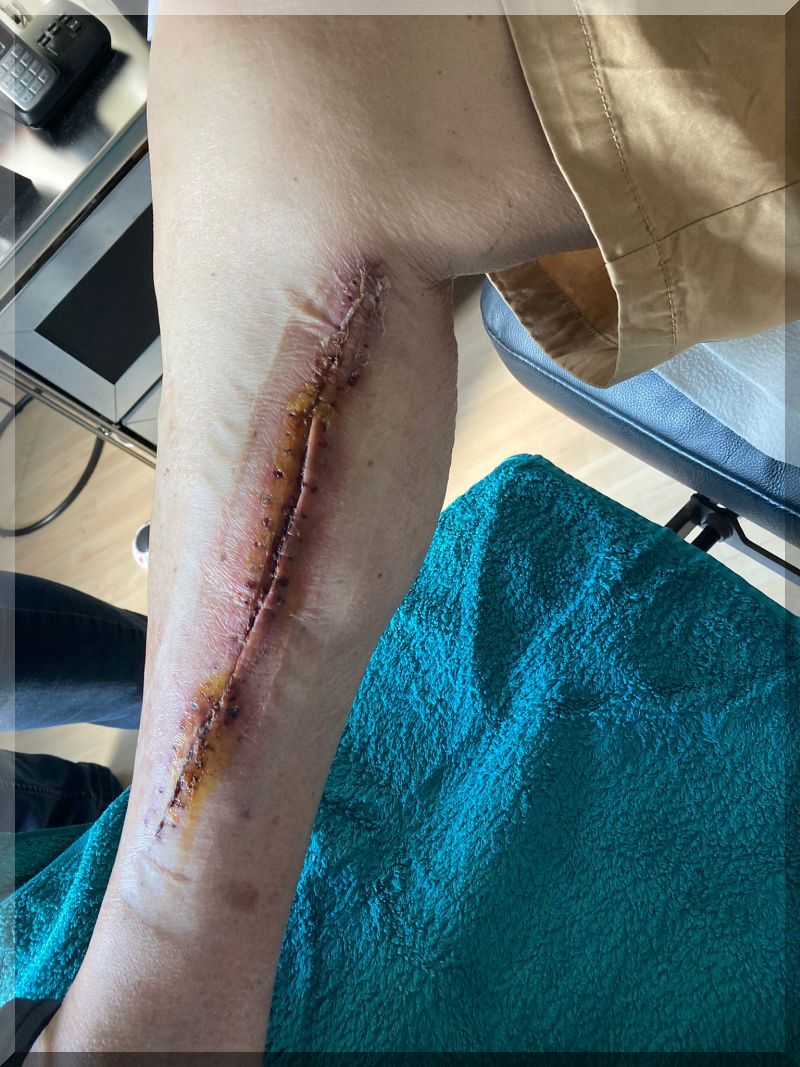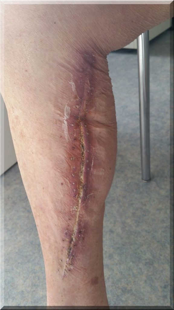 Täglich wurde meine OP-Narbe am Unterschenkel frisch verbunden. Noch immer ist die Narbe nicht 100%ig geschlossen, aber es wird jeden Tag ein wenig besser.
