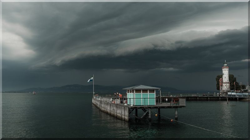 7:15 Uhr – Wetterlage: Aus den Alpen drängen furchterweckende, dicke schwarze Wolkenbänke von Süden auf den Bodensee zu. Im Osten strahlt noch die Morgensonne.