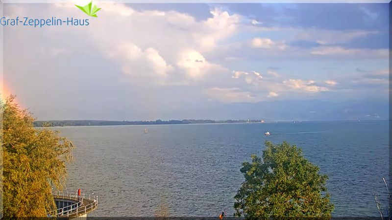 18:26 Uhr – Über dem Gelände der Birkle-Klinik steht ein Regenbogen. Die Starkwindwarnung blinkt immer noch. Richtung Allgäu ist der Himmel tiefschwarz. Überm See liegt ein wenig Sonne. Eine nett anzuschauende Komposition des Wetters.