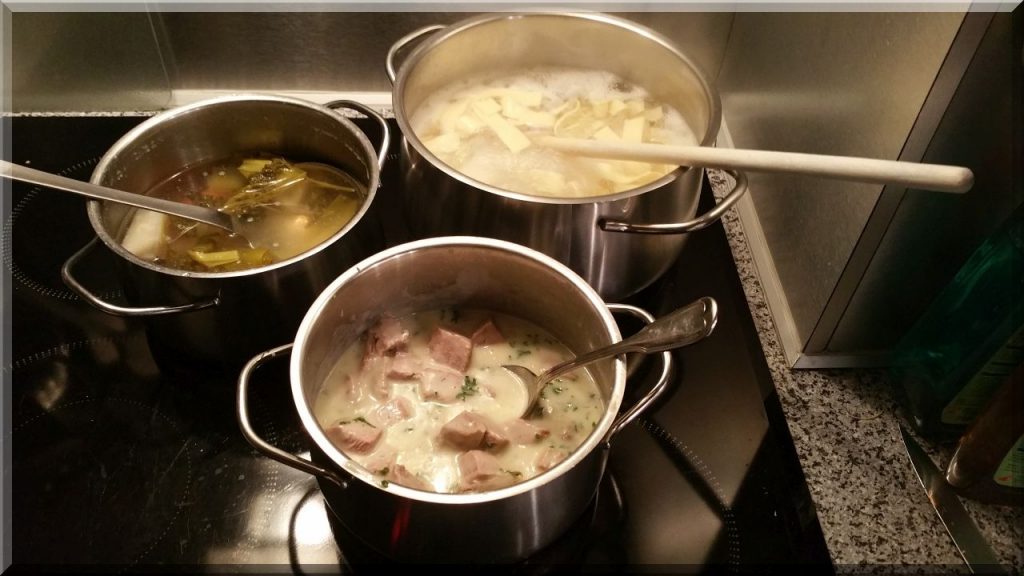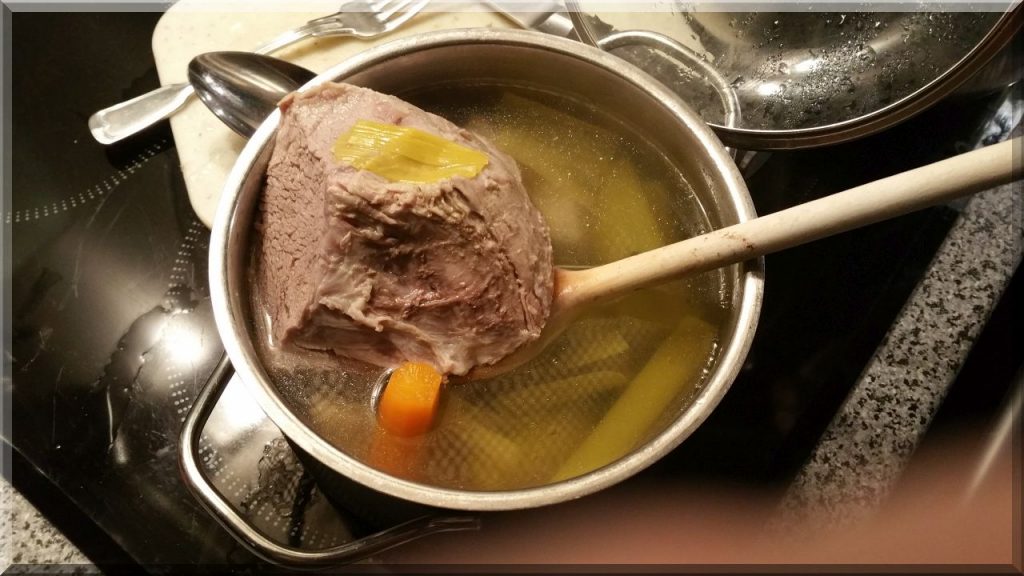 18 Uhr – Zum Abendbrot gab es noch die Reste vom vorgestrigen Festessen. Etwas abgewandelt mit Meerrettich und Erbsen/Karotten- Gemüse. Es war noch einmal richtig lecker.