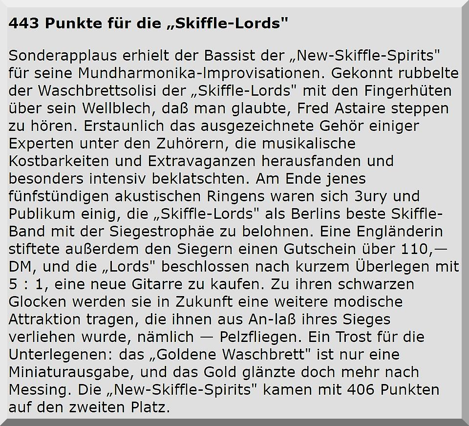 Wir, die Skiffle Devils, haben uns alle durchs Abitur gequält und danach nie wieder zusammen Musik gemacht. Der Ernst des Lebens hatte uns eingeholt. Unsere Eltern hatten schon befürchtet, dass wir in die Rock ’n‘ Roll Scene abrutschen könnten, wie es uns die LORDS vorgemacht hatten.