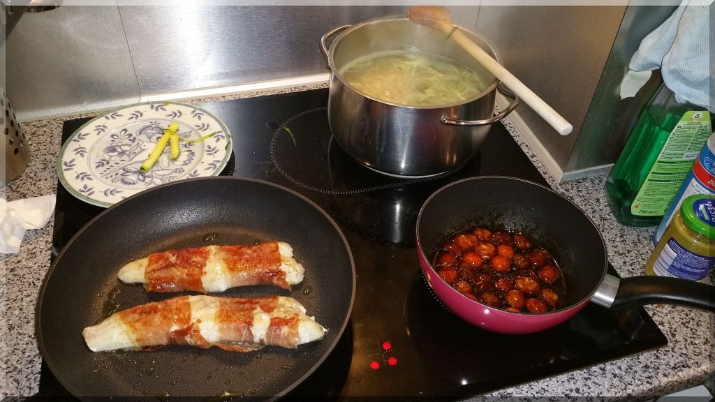 Zum Abendessen gab es daheim wieder unser derzeitiges Lieblingsessen, dicht gefolgt von Pasta mit Fenchel/Tomaten/Garnelen-Sauce am morgigen Tag:
