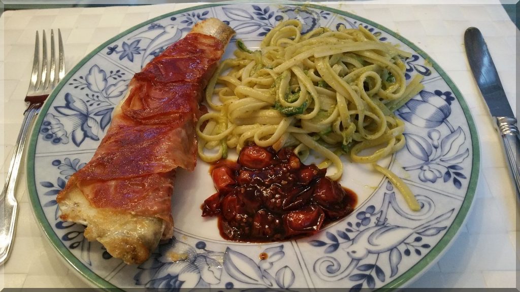Zanderfilet (TK) auftauen u. trocknen, leicht mehlieren und pfeffern (kein Salz) mit 1 Lage Ital. Schinken (z.B. Parma) ummanteln und von jeder Seite 3 Minuten bei 2/3 Hitze braten, sobald die Linguine 6 Minuten vor Erreichen des Garpunktes fertig sind. Linguine (100 g/ Pers.) und 3 Minuten vor dem Ende 1 Zucchini (mit der Julienne geschnitten) zu der Pasta dazugeben und nach dem Abgießen 150 ml Pesto Genovese untermischen. Gleich zu Beginn die halbierten Kirschtomaten in 1 TL Butterschmalz anbraten und dann mit 2- 3 EL Balsamico rosso dickflüssig einkochen (ca. 15 Minuten und die Temperatur langsam runterfahren).