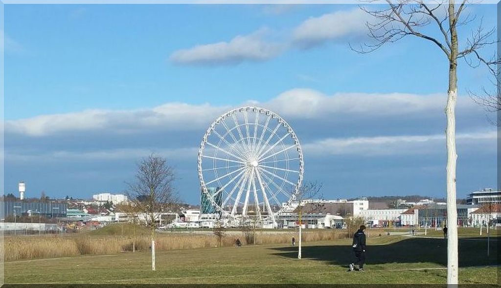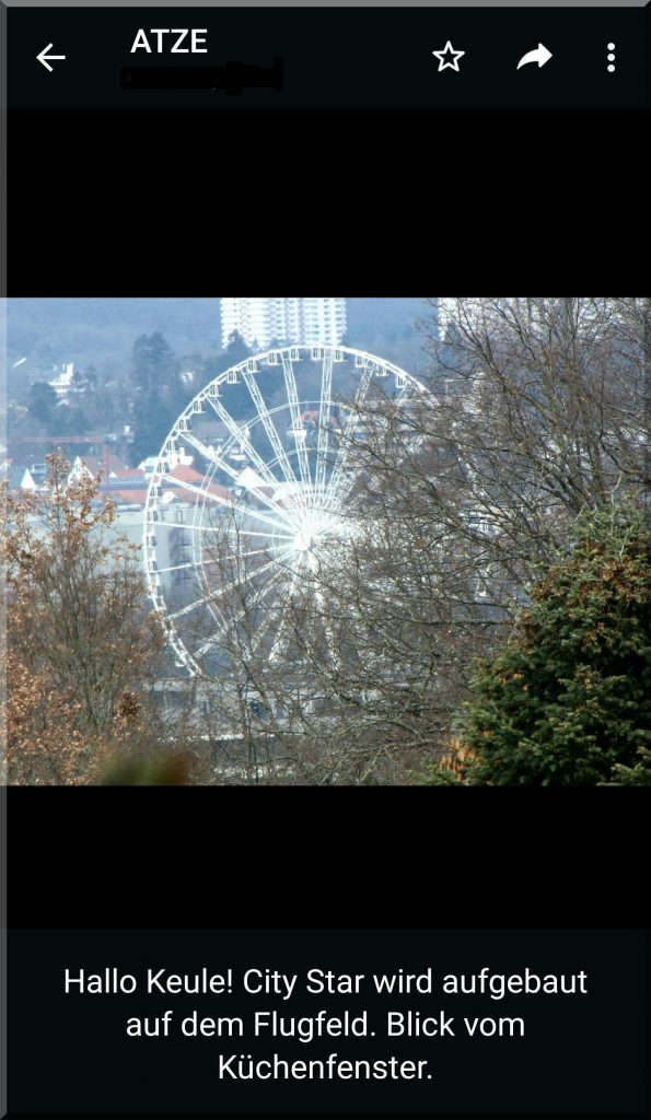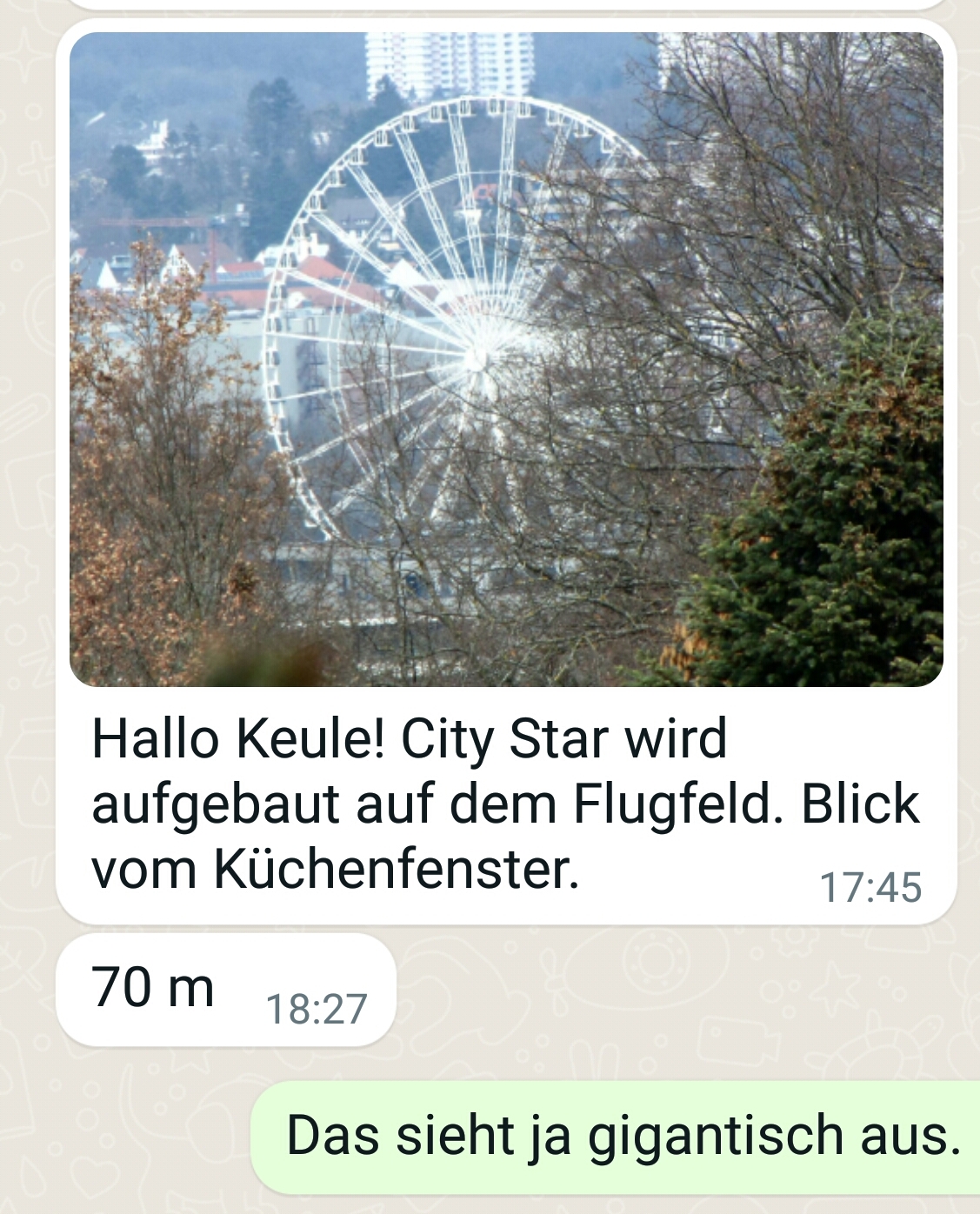 Das Bild hat Atze mit dem digitalen Tele geschossen, denn er wohnt in Luftlinie (2,2 Km südlich) leicht über dem Riesenrad.