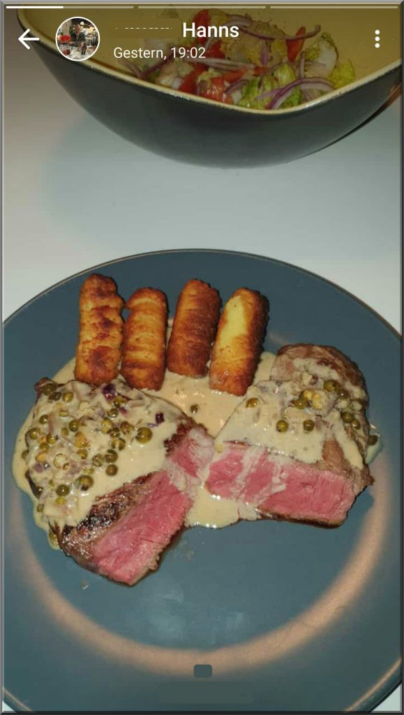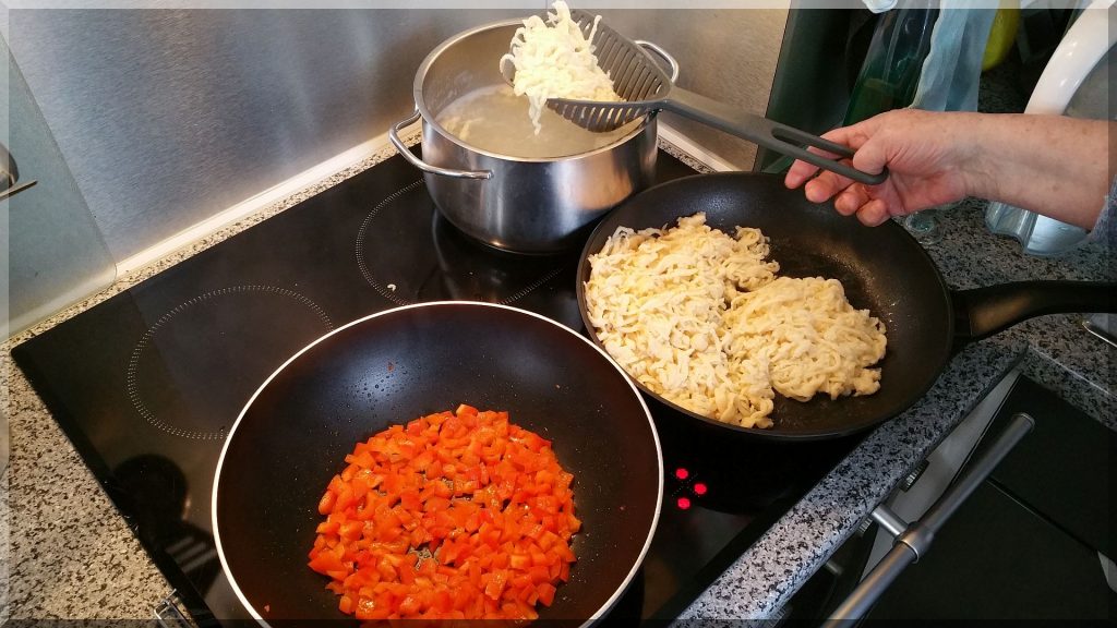 18 Uhr – Mein Appetit kehrt zurück. Wir machen uns Geschnetzeltes vom Schweinefilet mit Champignons in Sahnesauce, Zwiebeln und Safranfäden.