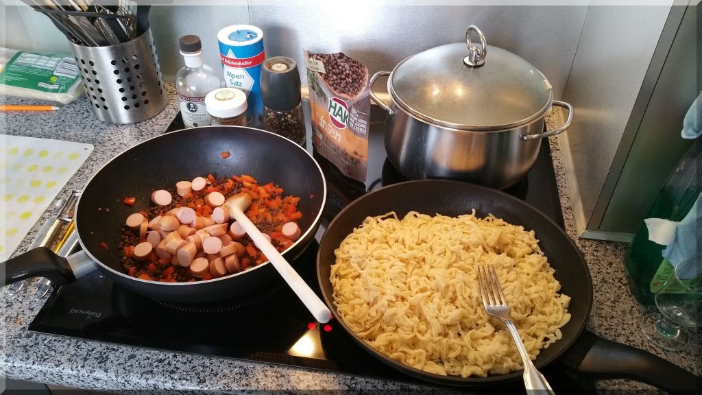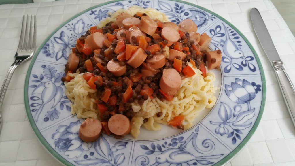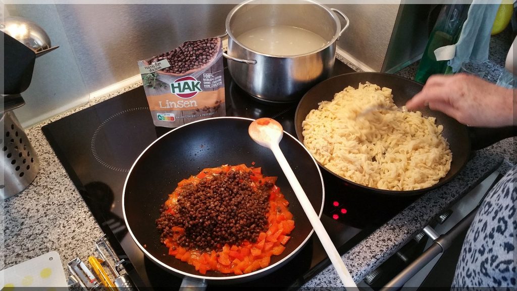 16:30 Uhr – Zeit, das Abendessen zuzubereiten, das wir letztmalig am 30. Januar 2023 gekocht hatten: Mit roter Paprika aufgemotzte Linsen mit zarten Würstchenscheiben und Spätzle (Frühlingszwiebeln hatten wir leider vergessen einzukaufen, eigentlich ein MUSS in jedem Linsengericht).