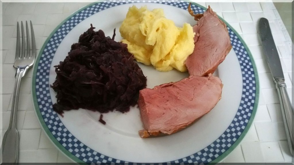 18 Uhr – Zum Abendessen gibt es: Schäufele mit Rotkraut und Kartoffelbrei
