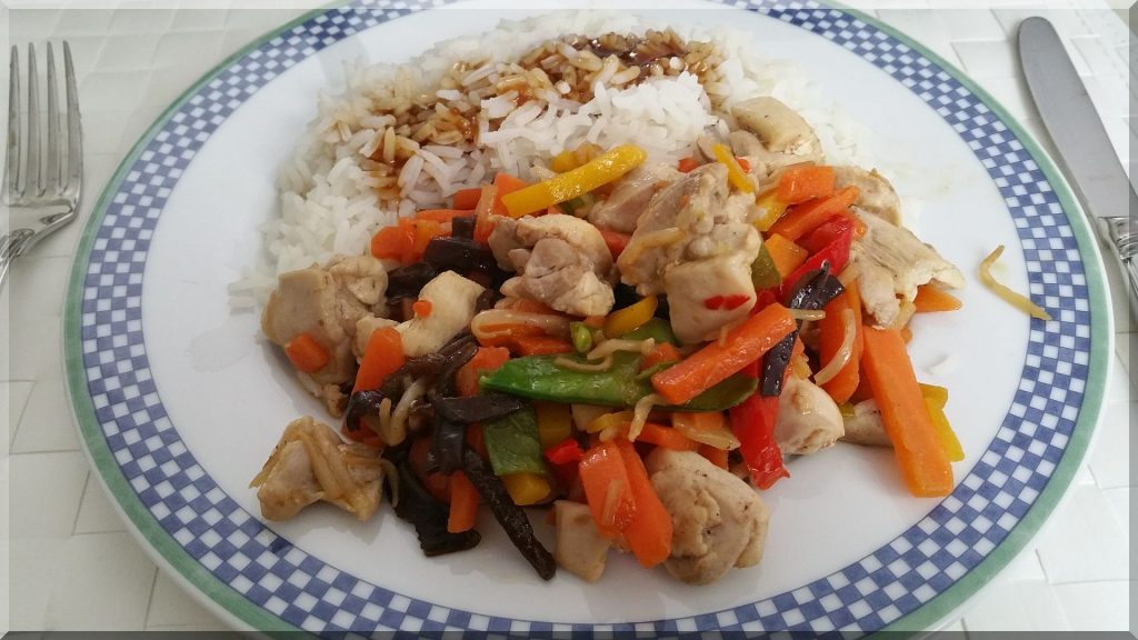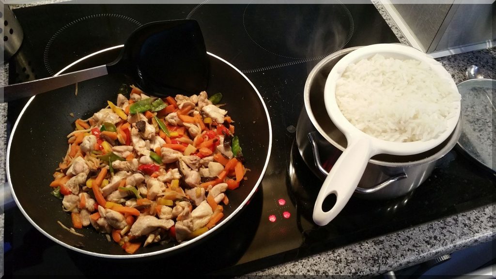 Eine Tasse Jasminreis wurde in 1,5 Ltr. Wasser 15 Minuten lang gekocht. Nach 10 Minuten wurde das gebratene Pollo fino unter das Gemüse gemischt.