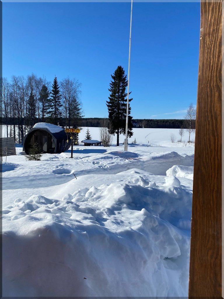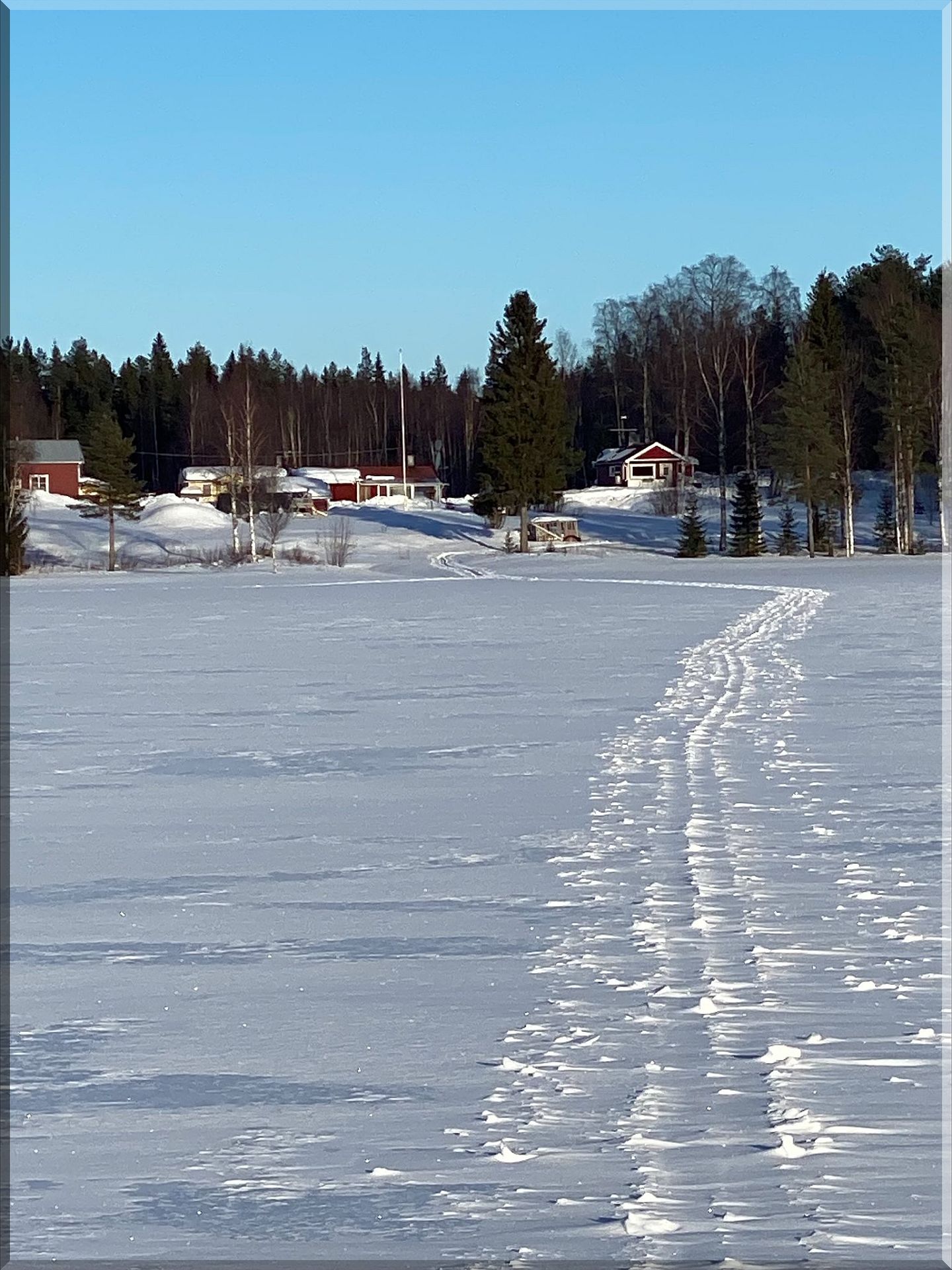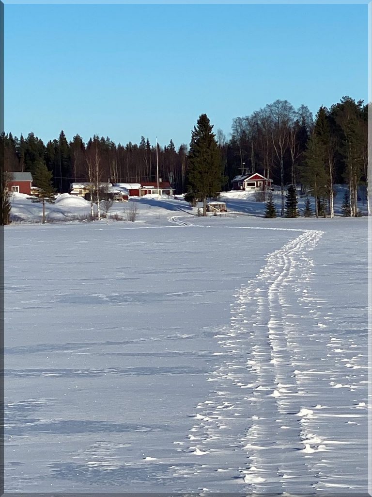 19:30 Uhr – Klaus (alias Diogenes) schickt noch allen Winterkonferenzlern einen kalten Gruß (um die -20 °C) aus Prinsnäs, im hohen Norden von Schweden. Der See mit seiner verwehten Ski-Langlaufspur grenzt an sein Grundstück: