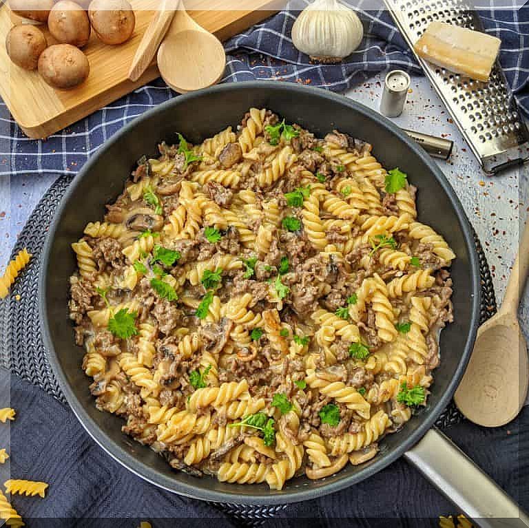 Zubereitung: Champignons vierteln und 5 Minuten scharf anbraten, dann 1 gewürfelte Zwiebel mitbraten, mit Salz, Pfeffer, 1 Knoblauchzehe u. 1 Prise Chili würzen, dann das Hackfleisch mit anbraten und 1 Tasse instant Gemüsebrühe dazugeben und je 1 EL Senf und Tomatenmark untermischen, 1 Würfel Rinderbullion aufmischen und schließlich 100 ml Sahne unterrühren und mit frischer Petersilie bestreuen.