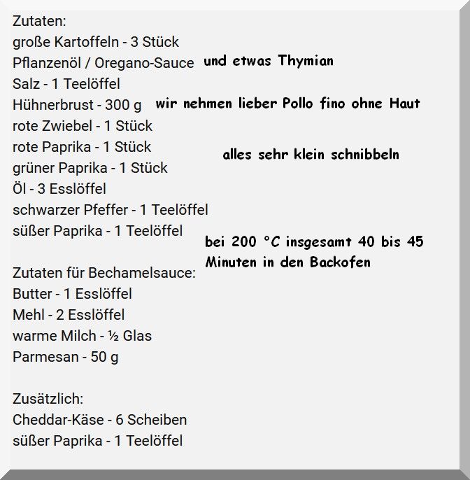 Da das Gericht mit rohen Kartoffeln gemacht wird, unbedingt 2 x 20 Minuten in den Backofen bei 200 °C schieben.