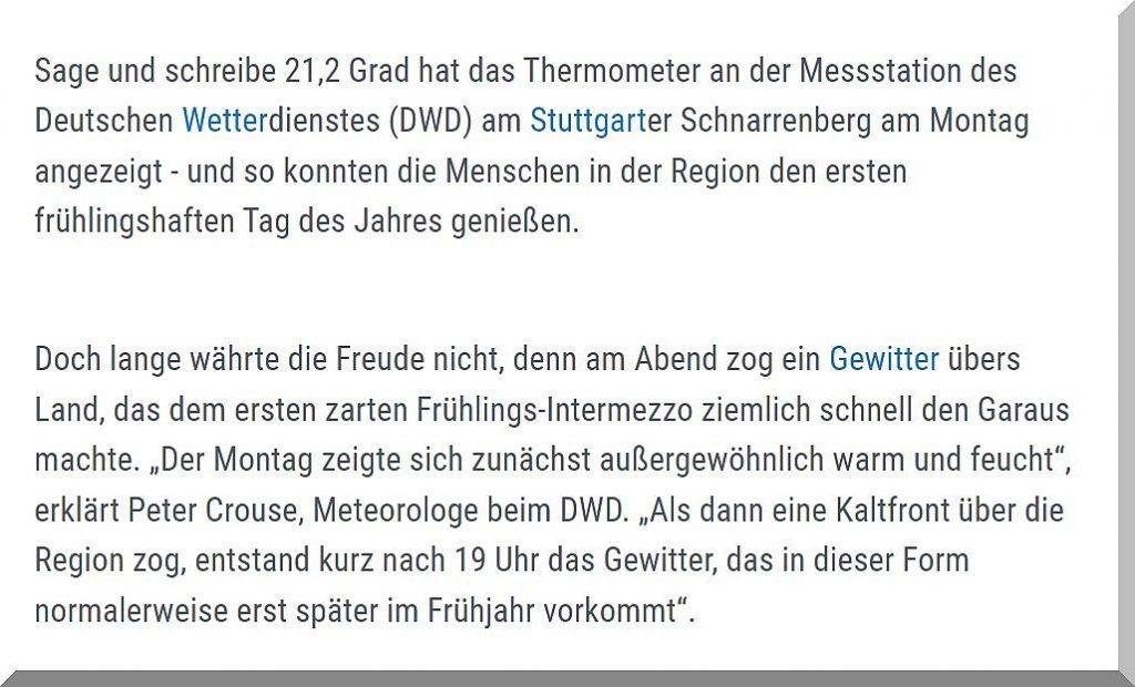 Auch ich habe seit über 50 Jahren meine Jahreszeiten, seitdem ich mit dem Segeln anfing, auf die der Meteorologen umgestellt. Ich habe dadurch den Eindruck, dass das Frühjahr 3 Wochen früher beginnt.