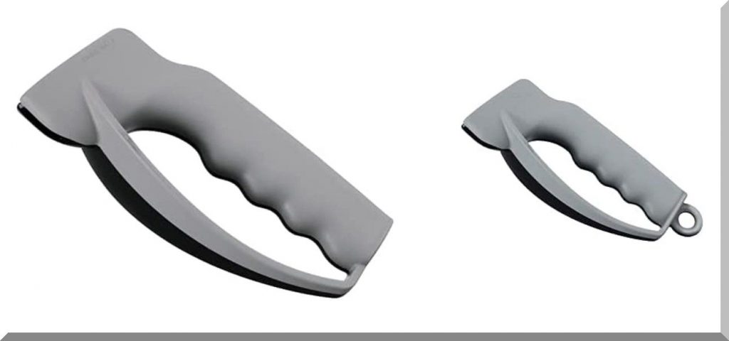Ferner habe ich uns die neuen Messerschärfer (groß = 24 € u. klein = 19 €) von Victorinox zugelegt, die das Messerschärfen für glatte Klingen und auch Wellenschliff zum Vergnügen macht: