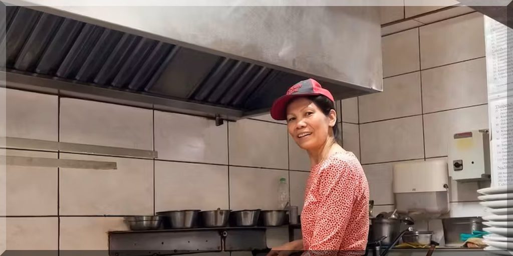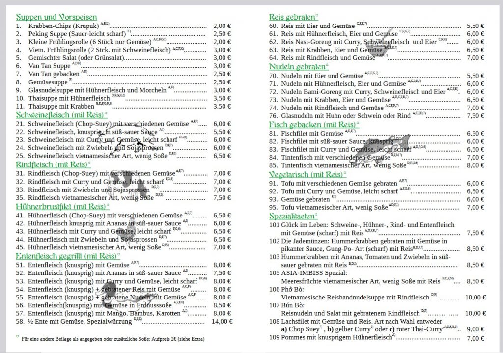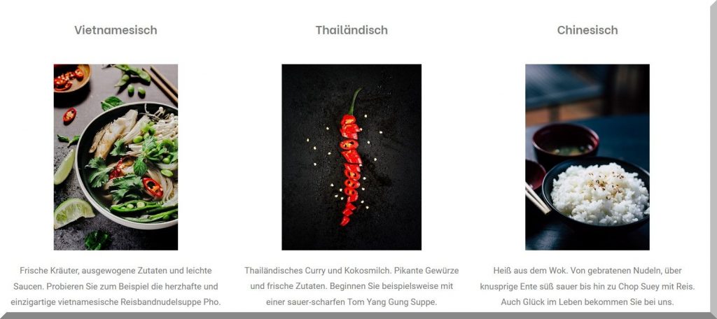 Fein vorbereitete Zutaten, feine Kräuter und leichte Soßen stehen in der Küche parat und warten auf den großen Einsatz mit der Kelle samt anschließendem Bad in einem der drei Woks. Gekocht werden in diesen, jede nach Wahl, thailändische, vietnamesische oder chinesische Gerichte, Gemüse Fisch, Krabben, Huhn, Rind oder Schwein, Reis oder Nudeln, herzhafte vietnamesische Reisbandnudelsuppe oder gebackene Bananen. Es gibt Scharfes mit Curry und Kokosmilch oder knusprige Ente süß-sauer. Und als Spezialität gibt’s „Glück im Leben“ – wovon man ja eigentlich nicht genug bekommen kann.