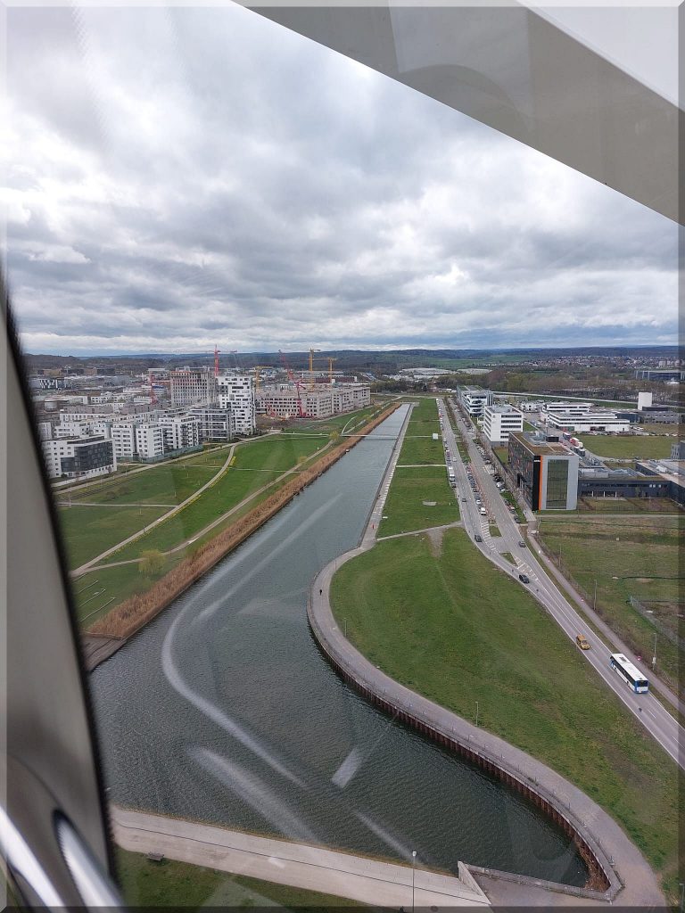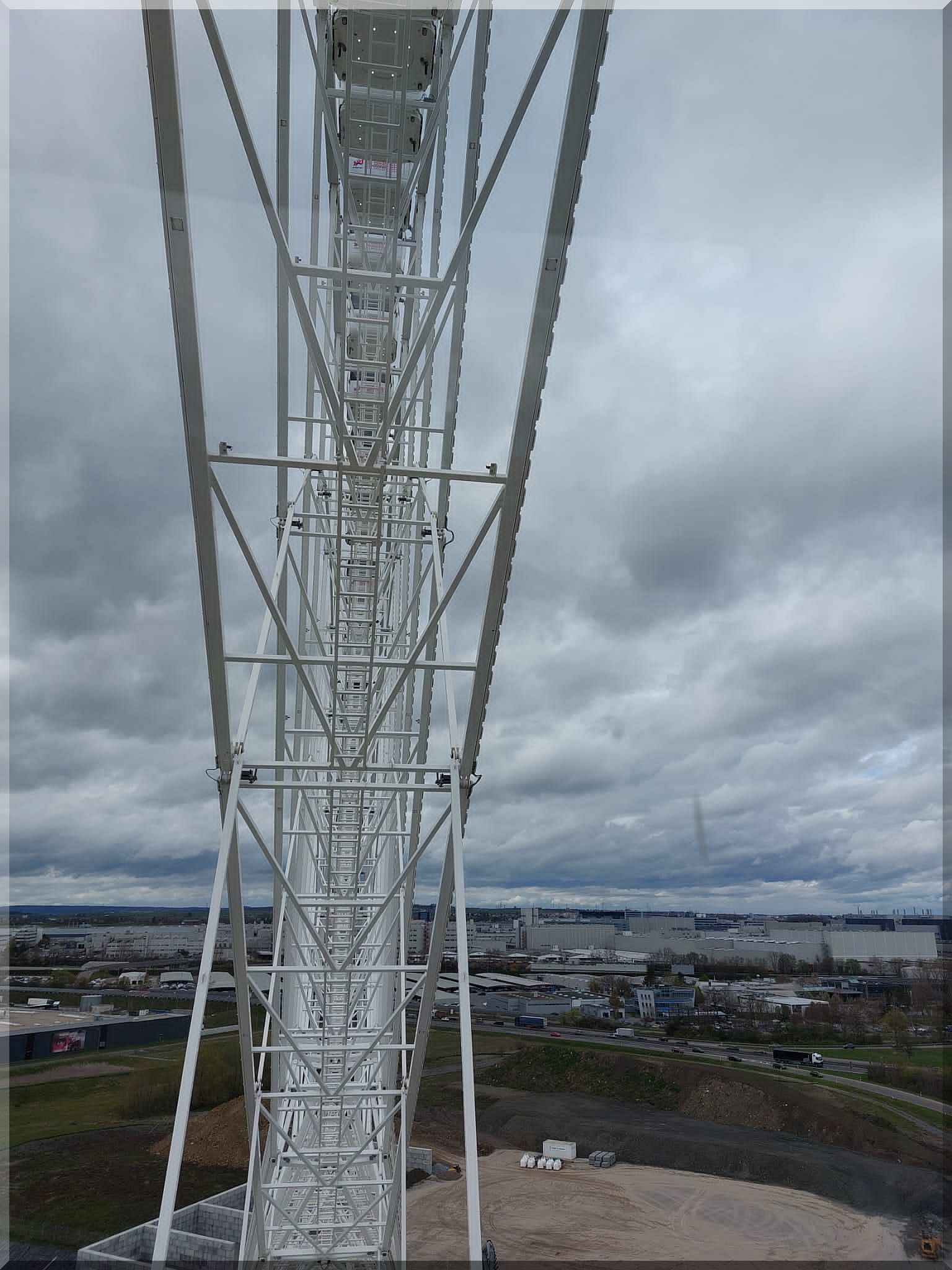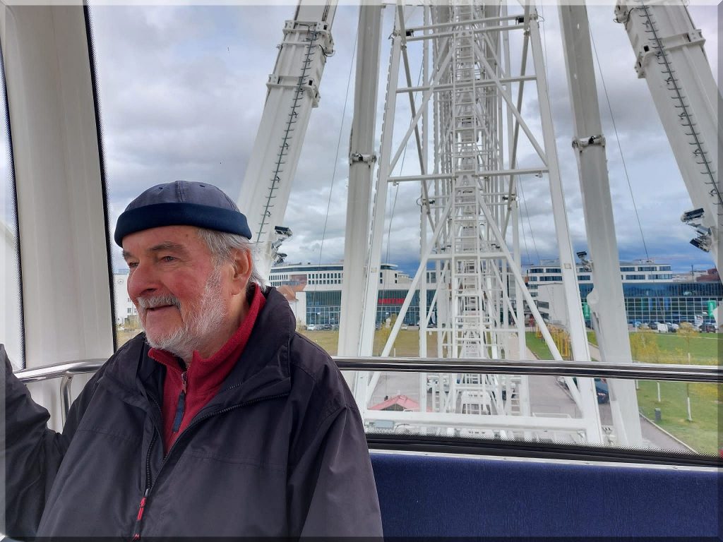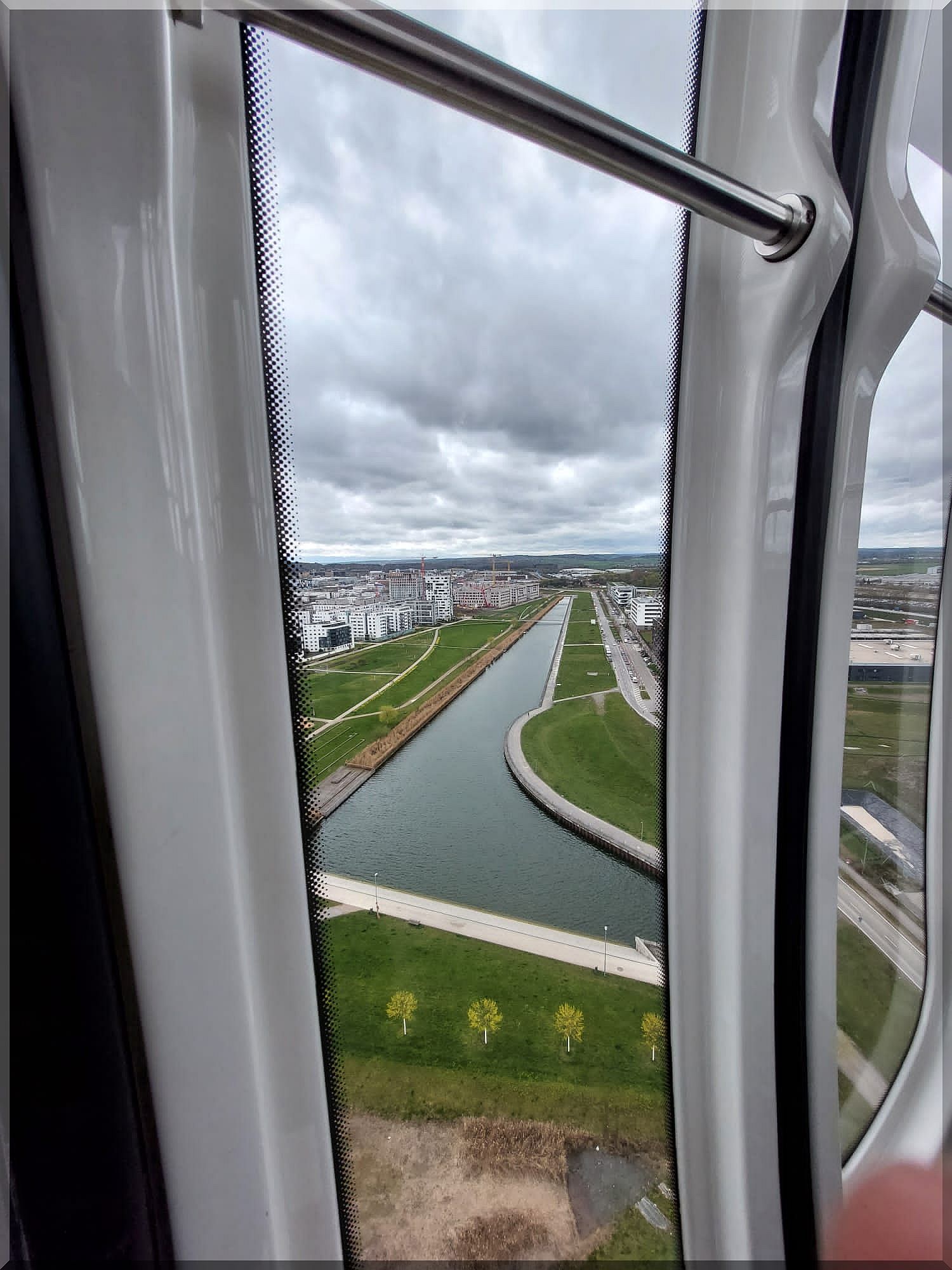 14:30 Uhr – Das Wetter hat sich plötzlich gebessert und meine Tochter und ich, wir machen uns auf zum Flugfeld. Wir runden den langen See, der eher wie ein Kanal aussieht. Als wir herum sind, steigen wir mutig ins Riesenrad ein – nicht viel los. Es ist doch ganz schön aufregend, stellen wir fest. Ganz oben angelangt wird einem doch ein wenig mulmig, besonders wenn man unter sich in die Tiefe schaut. Da so wenig Fahrgäste da sind, läßt man uns 4 Runden drehen – alles blieb gut.