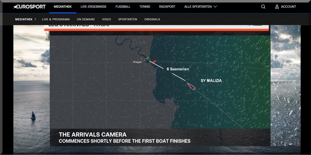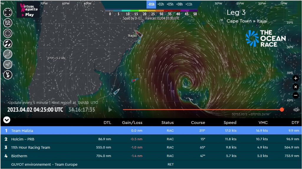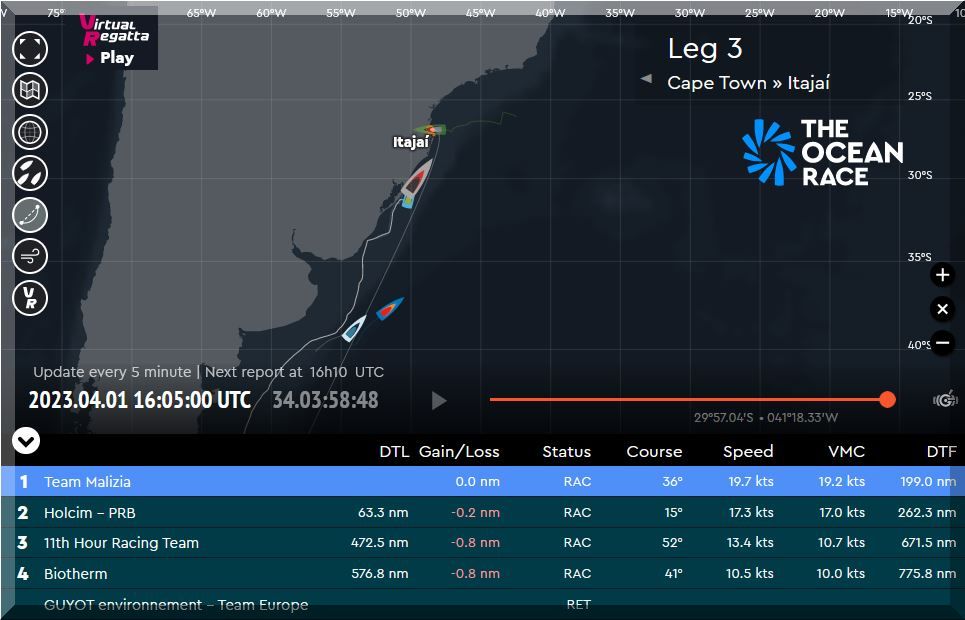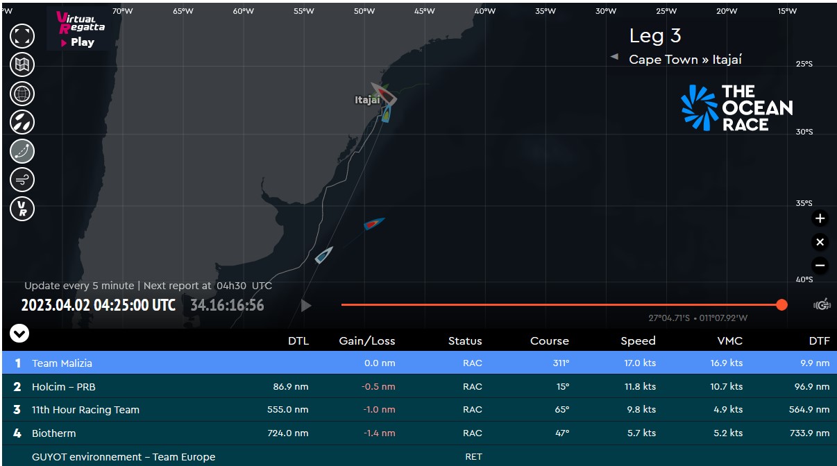 04:35 UTC = 06:35 MESZ – MALIZIA hat nur noch 6.7 Seemeilen bis zur Ziellinie in Itajai.