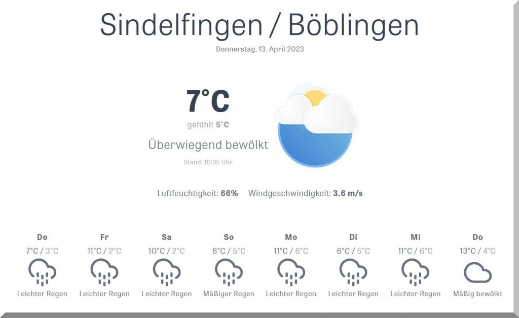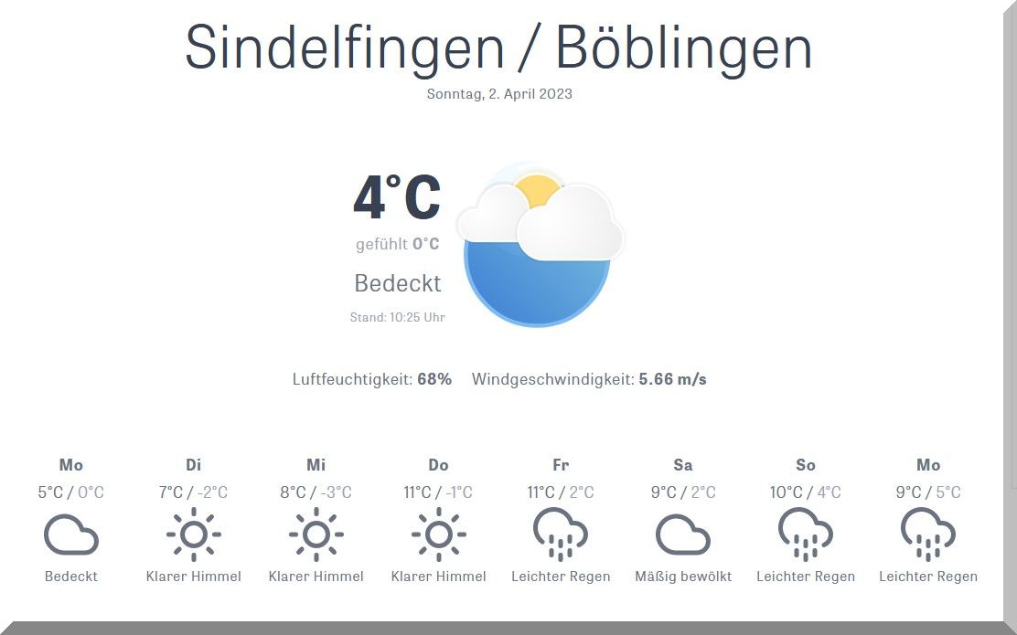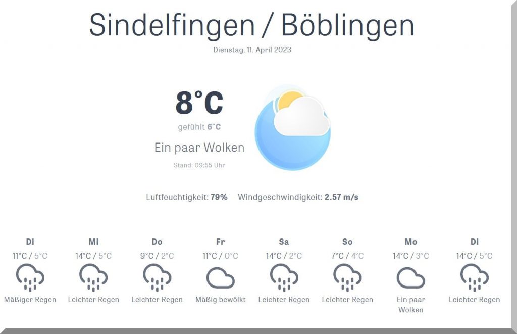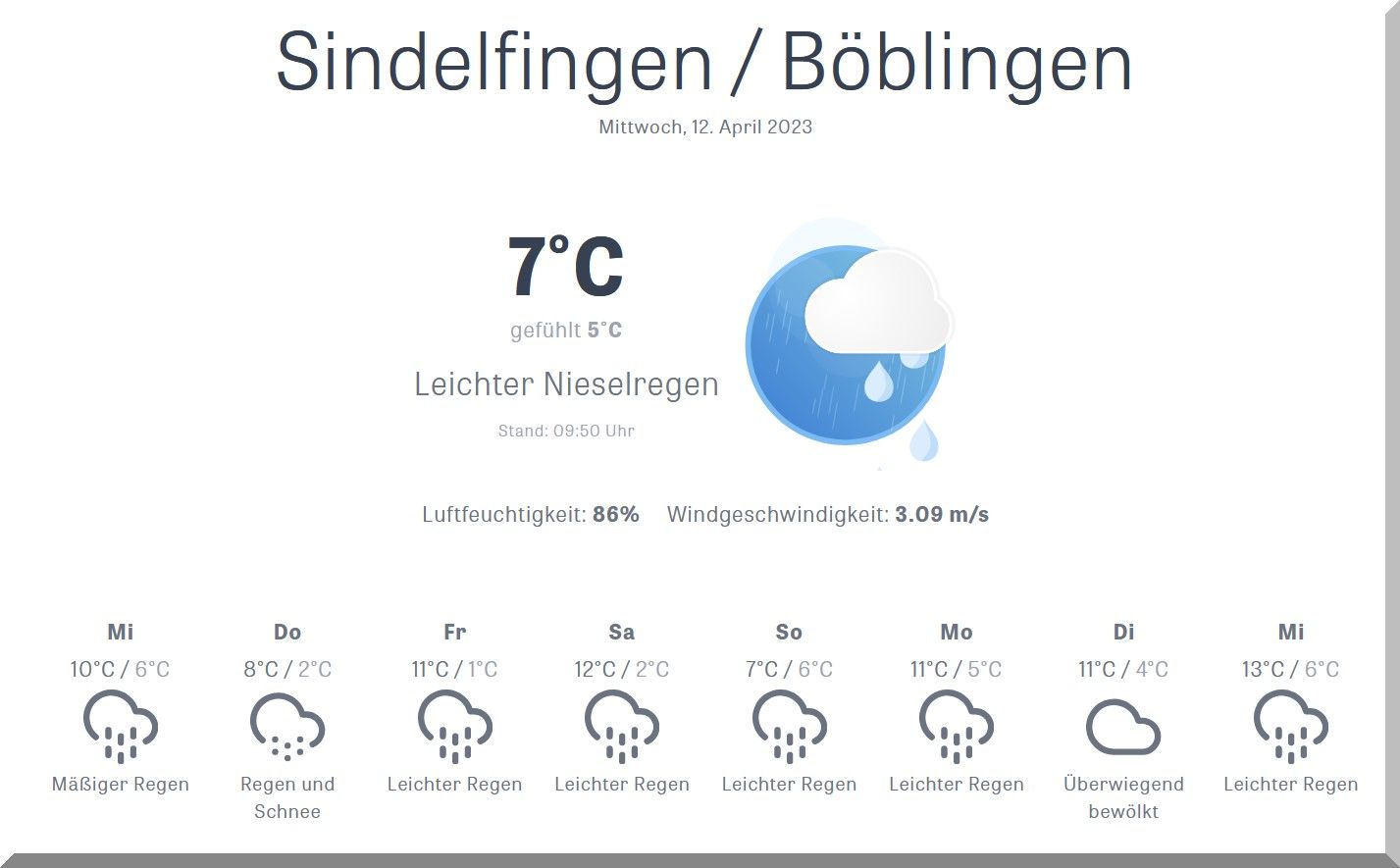 Auch in Sindelfingen/Böblingen herrscht kaltes, regnerisches Wetter. Bin gespannt, ob meine Tochter und ich meinen verschobenen Rehaspaziergang vom Montag (Feiertag) nachholen werden.