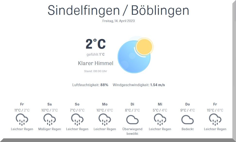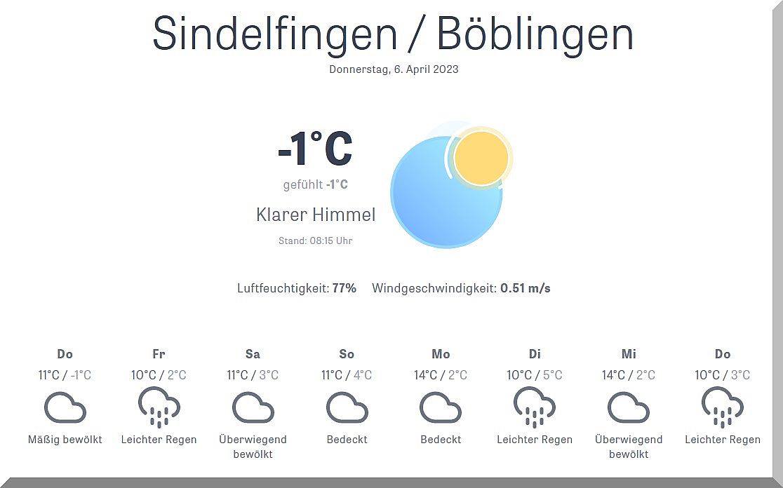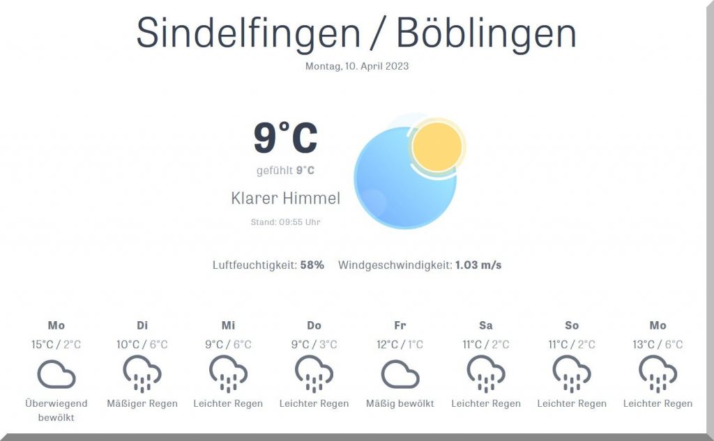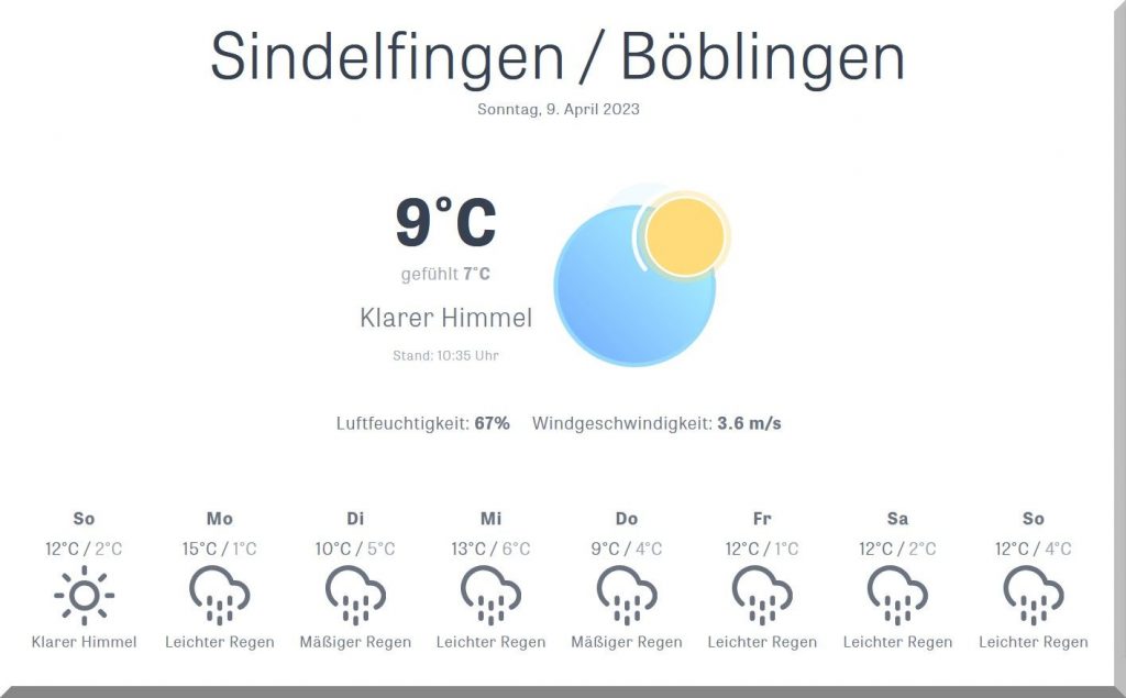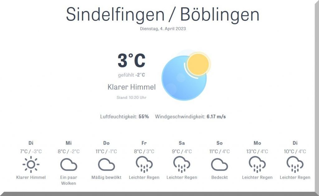 Auch in Sindelfingen/Böblingen herrscht kaltes, regnerisches Wetter. Bin gespannt, ob meine Tochter und ich meinen verschobenen Rehaspaziergang vom Montag (Feiertag) nachholen werden.
