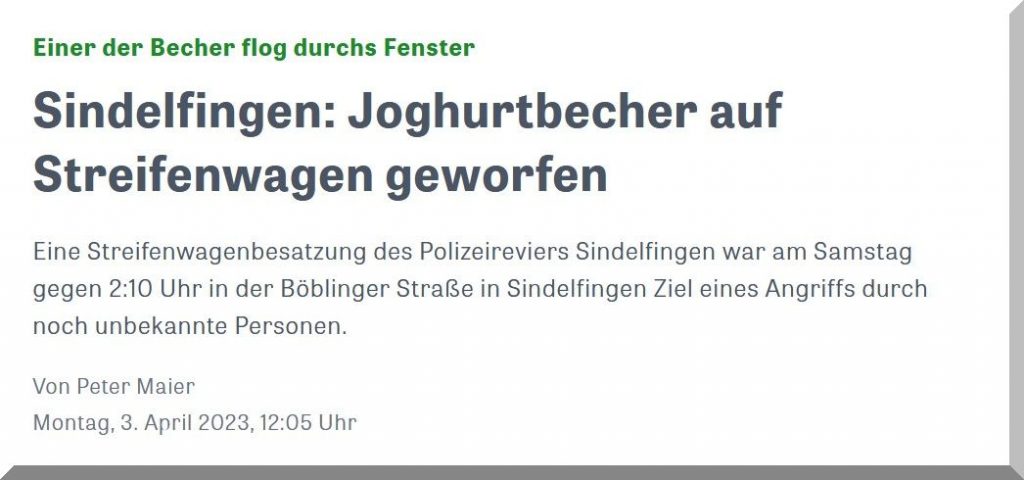 Die noch unbekannten Personen warfen vermutlich aus einem Gebäude heraus insgesamt vier volle Joghurtbecher gezielt in Richtung des geöffneten Beifahrerfensters des fahrenden Streifenwagens. Drei der Becher verfehlten den Streifenwagen. Der vierte Becher traf das Fahrzeug auf der Beifahrerseite, so dass sich Joghurt auf der B-Säule und den Seitenscheiben verteilte. Ein Teil des Joghurts gelangte zudem ins Fahrzeuginnere und traf die dort sitzende Polizeibeamtin. Durch den Wurf der Joghurtbecher wurde niemand verletzt, an dem Polizeiwagen entstand kein Sachschaden. Nach dem Angriff wurde die Umgebung durch mehrere Streifenwagenbesatzungen sowie Einsatzkräften der Polizeihundeführer abgesucht. Verdächtige Personen konnten dabei jedoch nicht festgestellt werden.