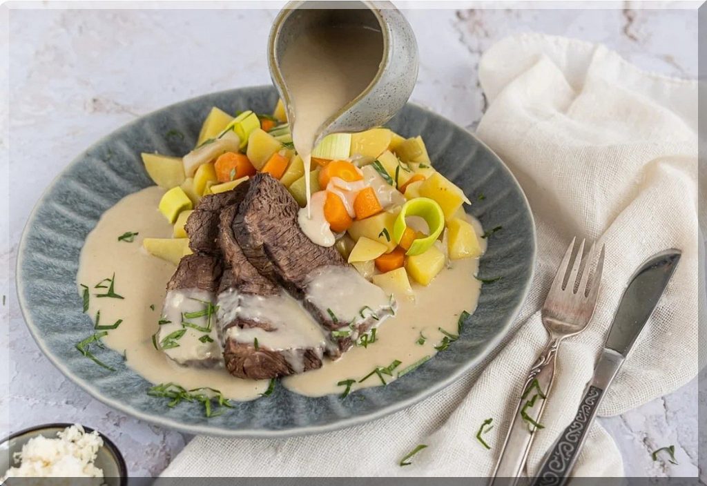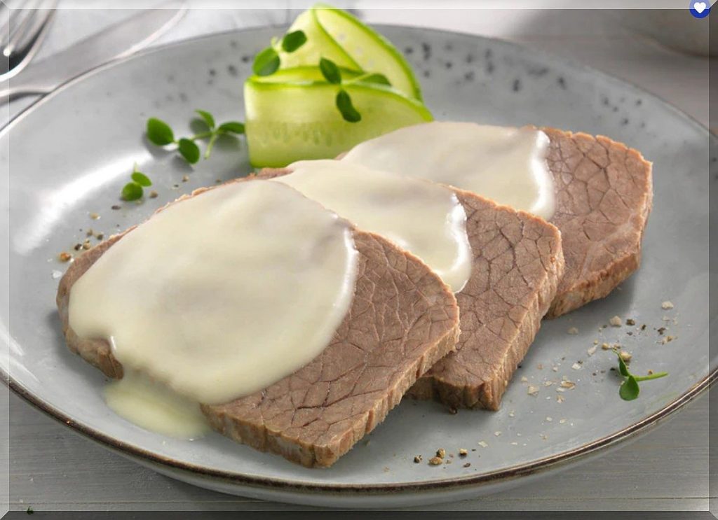 Champignons in Scheiben und Zwiebelwürfel scharf anbraten, dann das Rinderhackfleisch dazugeben und mit Salz, Pfeffer u. 1 Prise Chili würzen, 1 Tasse Wasser und je einen Strang Tomatenmark u. Delikatess-Senf und 1 Soßenwürfel (Knorr klare Bratensaft Basis) hinzugeben, 50 bis 100 ml Sahne unterheben.